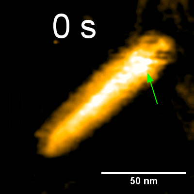 The growth of a replicator fiber is accompanied by the consumption of precursor aggregates, as observed by high-speed atomic force microscopy.