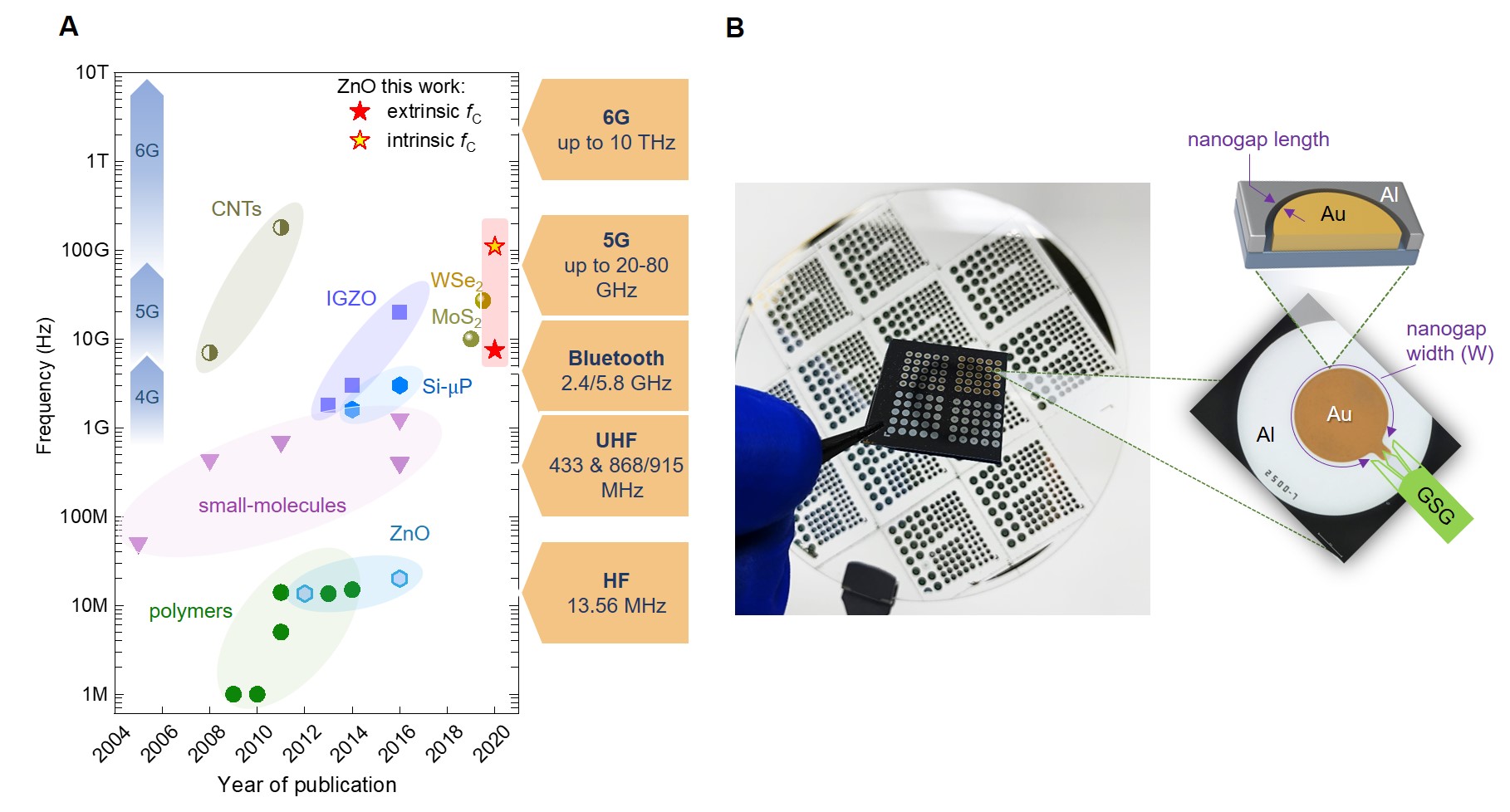 We fabricated our devices using a novel nanopatterning technique, called adhesion lithography (see also our article published in npj Flexible Electronics), that allows for high-throughput manufacturing of variable aspect ratio nanogap-separated electrodes on wafer-scale substrates (Fig. 1b). Furthermore, by meticulously doping the abundant low-cost semiconductor zinc oxide (ZnO) with Aluminium, we tune the thin film electron transport properties and demonstrate rectifier circuits that are able to operate at extremely high frequencies of tens of GHz.