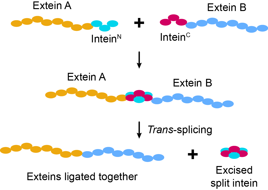 Nature has evolved numerous proteins for the manipulation of DNA, which we use in the lab on a daily basis. We cut it, ligate it, modify it; but what about proteins? Of course, there are proteases that can cut proteins, but tools for the post-translational ligation of proteins are somewhat more unusual. Here, we show the remarkable capabilities of split inteins as protein ligation tools (Fig. 1).