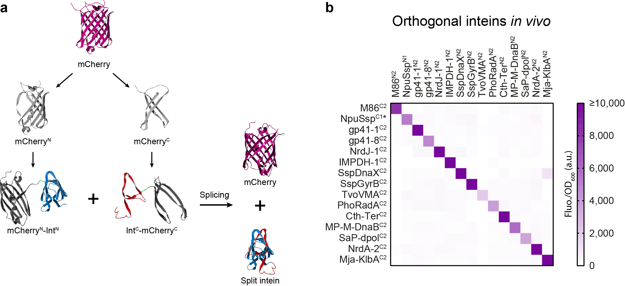 Figure 3 | A novel split mCherry platform (a) for rapidly assessing split inteins trans-splicing and orthogonality (b).