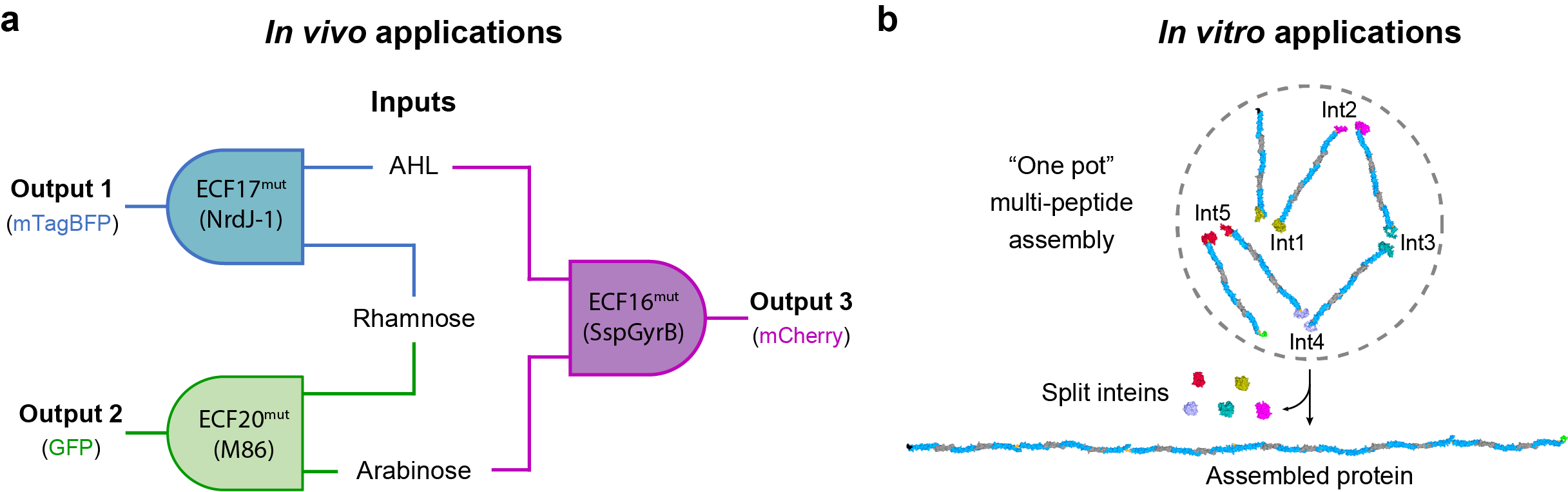 Figure 4 | Split inteins enabled complex genetic circuits (a) and in vitro large protein assemblies (b).