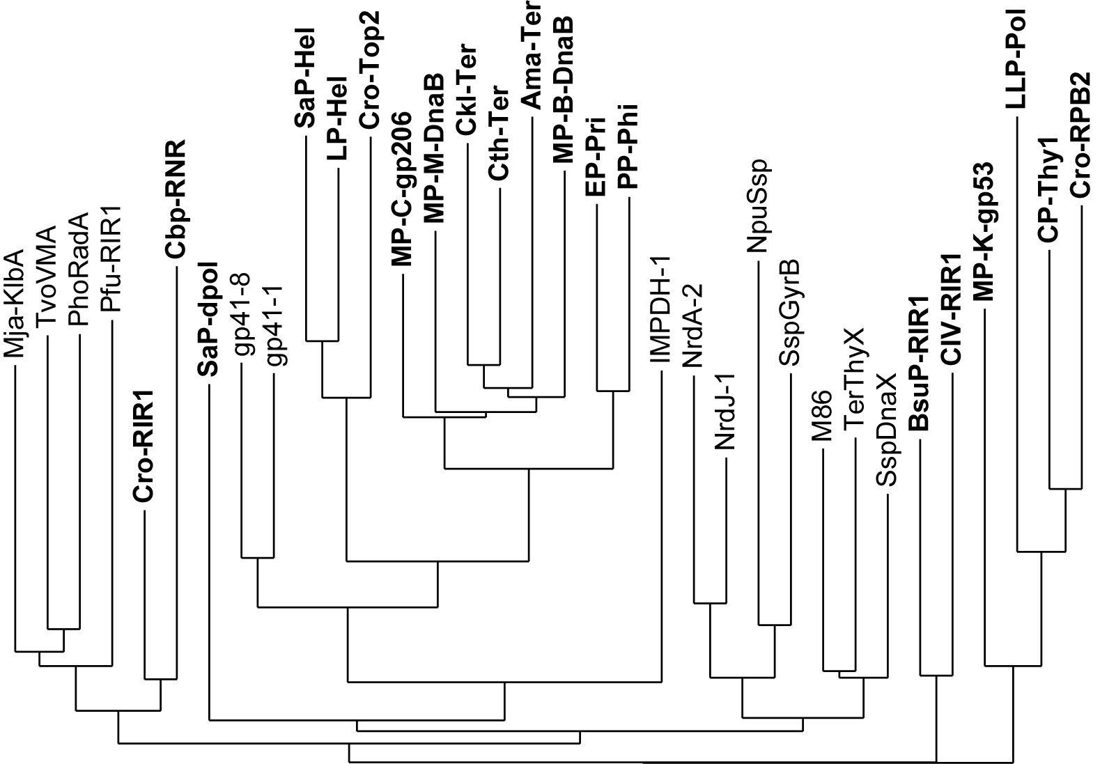 Figure 2 | Phylogram based on the structural alignment of the 34 inteins selected for characterization (inteins retrieved from InBase are in bold).