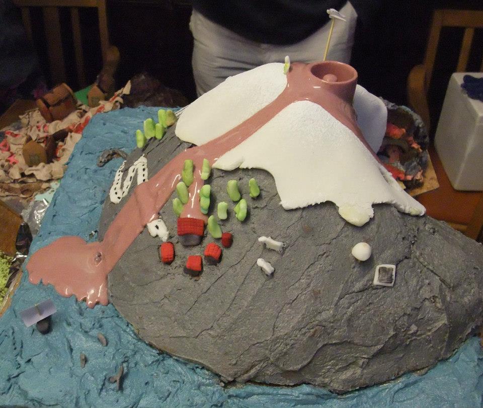 Phase 3 was largely powered by cake. A "cake your research" themed competition led to the creation of a fully functioning volcano cake, with a chocolate fountain-powered lava flow seen here inundating a forest and village. Photo credit Sarah Brown.