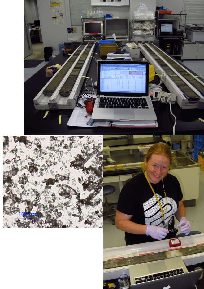 Phase 2: Ground truthing. The top photo shows cores laid out ready for examination. The stripes represent different types of sediment that were deposited through time. Bottom right, sampling the white layer and preparing a smear slide that can be examined under a microscope. Bottom left shows glassy ash fragments, confirming the sampled layer contains volcanic material. Photo credits: Sue Mahony.