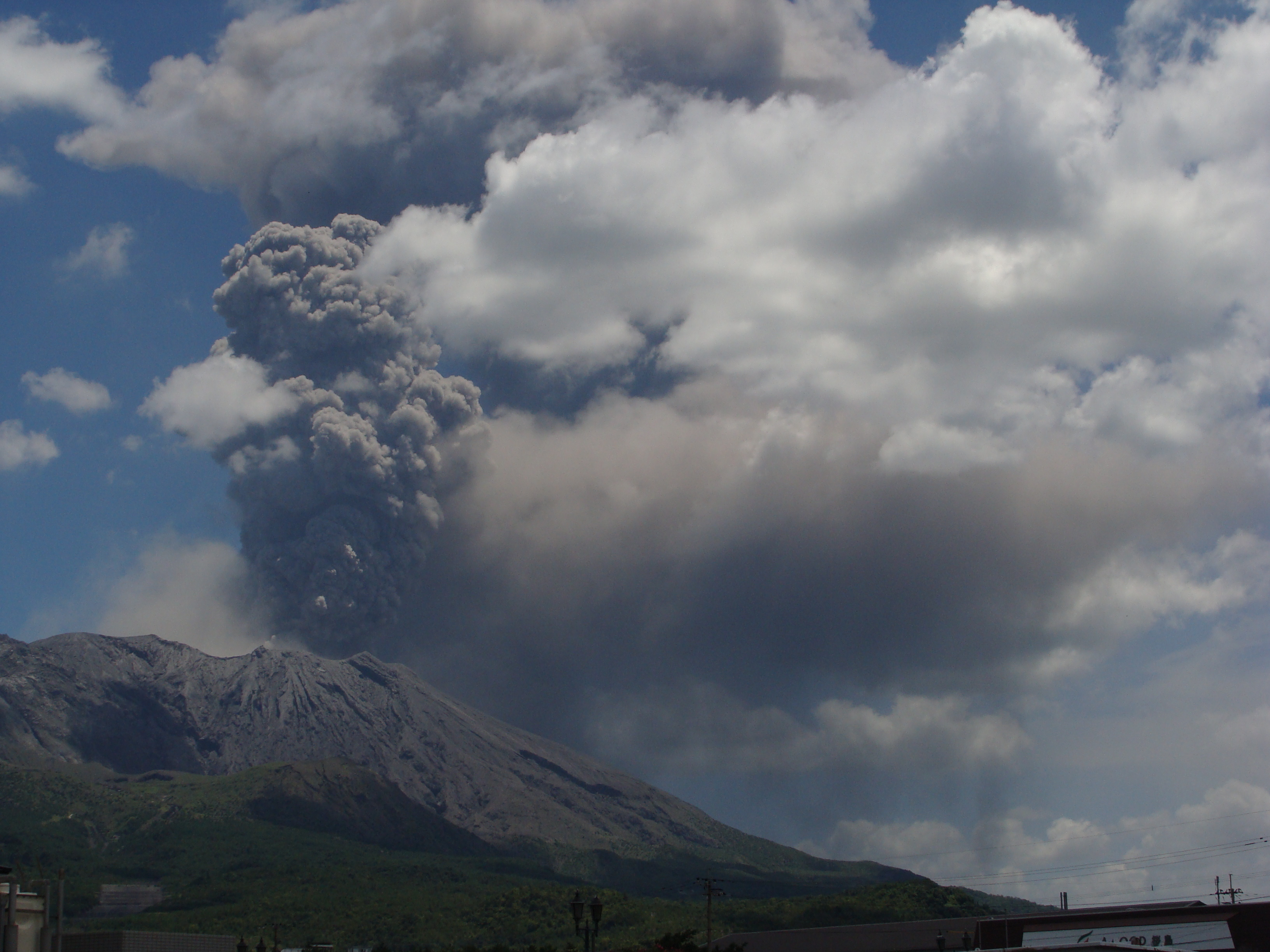 19th July 2013: a small eruption of Sakurajima volcano, Japan. The grey cloud on the right is made of volcanic ash, the lower less opaque areas of grey cloud show the ash being deposited onto the land. Photo credit Sue Mahony.