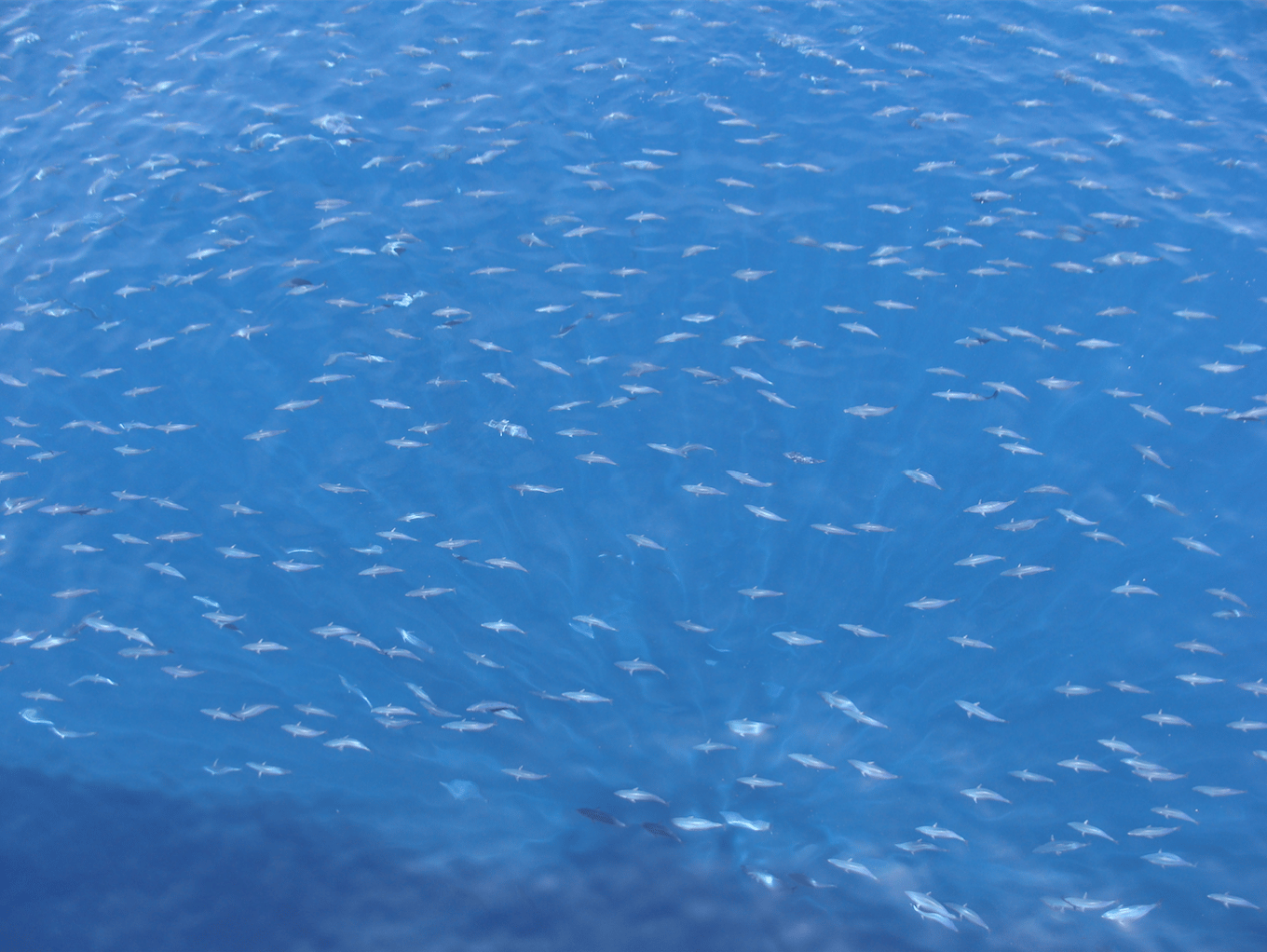 Life at sea on an IODP expedition. Coring a deep drill hole involved being stationary for long enough that the ocean life decided we were their new home. Thousands of tuna circled the ship, an albatross stopped by and huge squid were seen catching flying fish out of the air. Photo credit Sue Mahony.