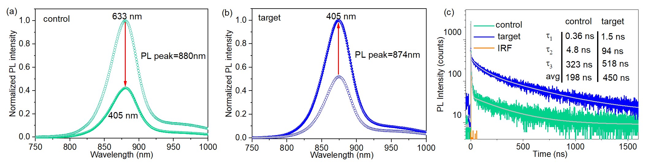 Figure 2. Reduced recombination due to the presence of Cd(O,S,Se,Te) region. (a) Steady-state PL spectra with different excitation beam wavelengths (405 and 633 nm) entering from the glass side for the (a) control and (b) target devices. (c) Time-resolved PL (TRPL) and the corresponding 3-exponential fitting curves for the control and target devices.