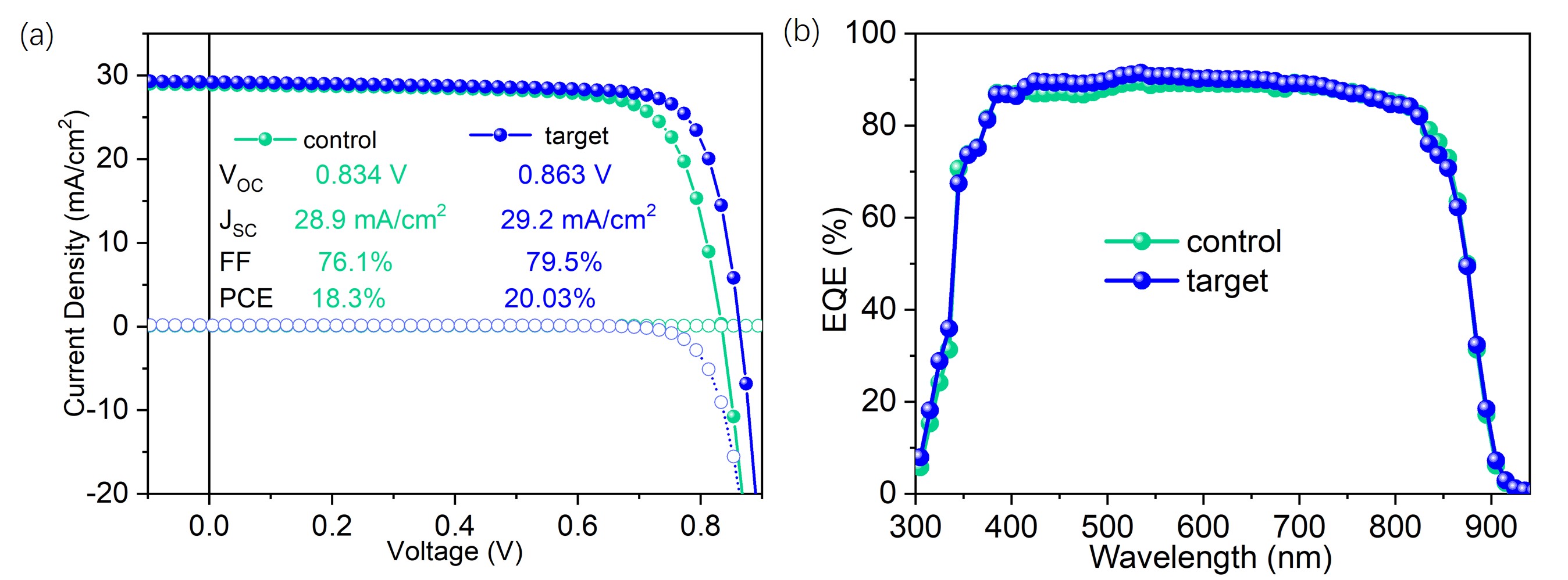 Figure 3. Performance improvement of devices with the Cd(O,S,Se,Te) region. (a) J-V and (b) EQE curves for the champion control and target devices.