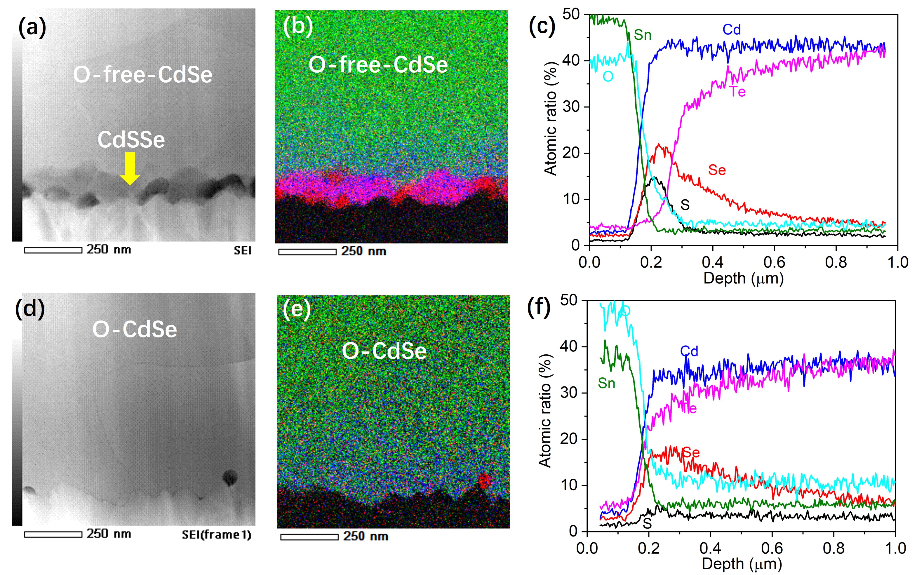 Here, we report an approach to overcome this issue. The key to this success was the incorporation of oxygenated CdS and CdSe layers (Cd(O,S), Cd(O,Se)) before the deposition of CdTe absorber layer. If pure CdS and CdSe layers were used, a photo-inactive wurtzite Cd(S,Se) layer would form, and consequently, an additional hetero interface would also form, as shown in Figure 1a-c. If Cd(O,S) and Cd(O,Se) were used, a region of penternary cadmium chalcogenide, Cd(O,S,Se,Te), was formed during CdCl2 treatment (Figure d-f). This penternary cadmium chalcogenide has the same zinc blend structure of the absorber, without forming an additional detrimental hetero interface, and is photoactive.