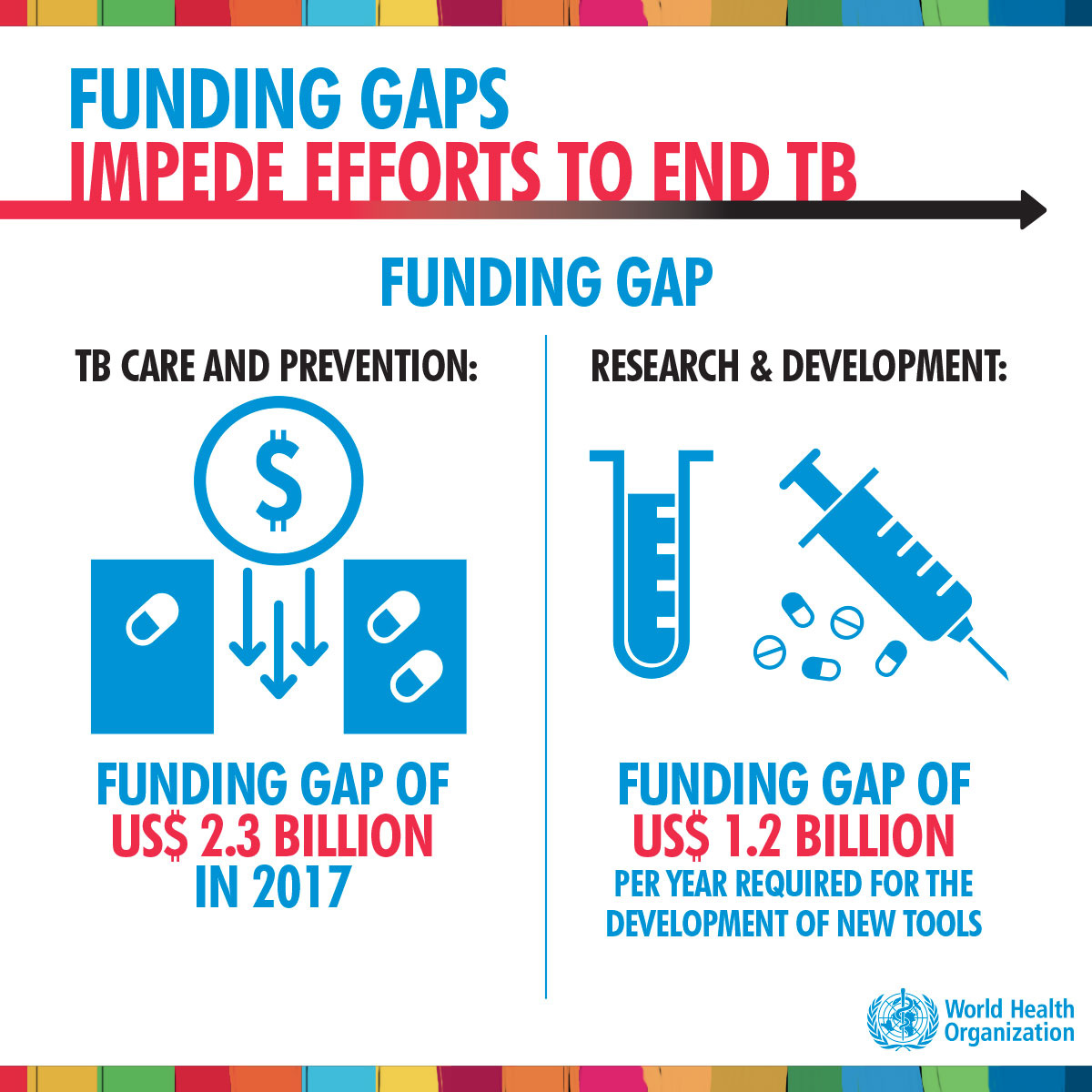 It is depressing that TB continues to suffer from limited financing by high burden countries. For TB care and prevention, investments in low and middle-income countries fall almost US$ 2.3 billion short of the US$ 9.2 billion needed in 2017. In addition, at least an extra US$ 1.2 billion per year is required to accelerate the R&D of new vaccines, diagnostics, and medicines.