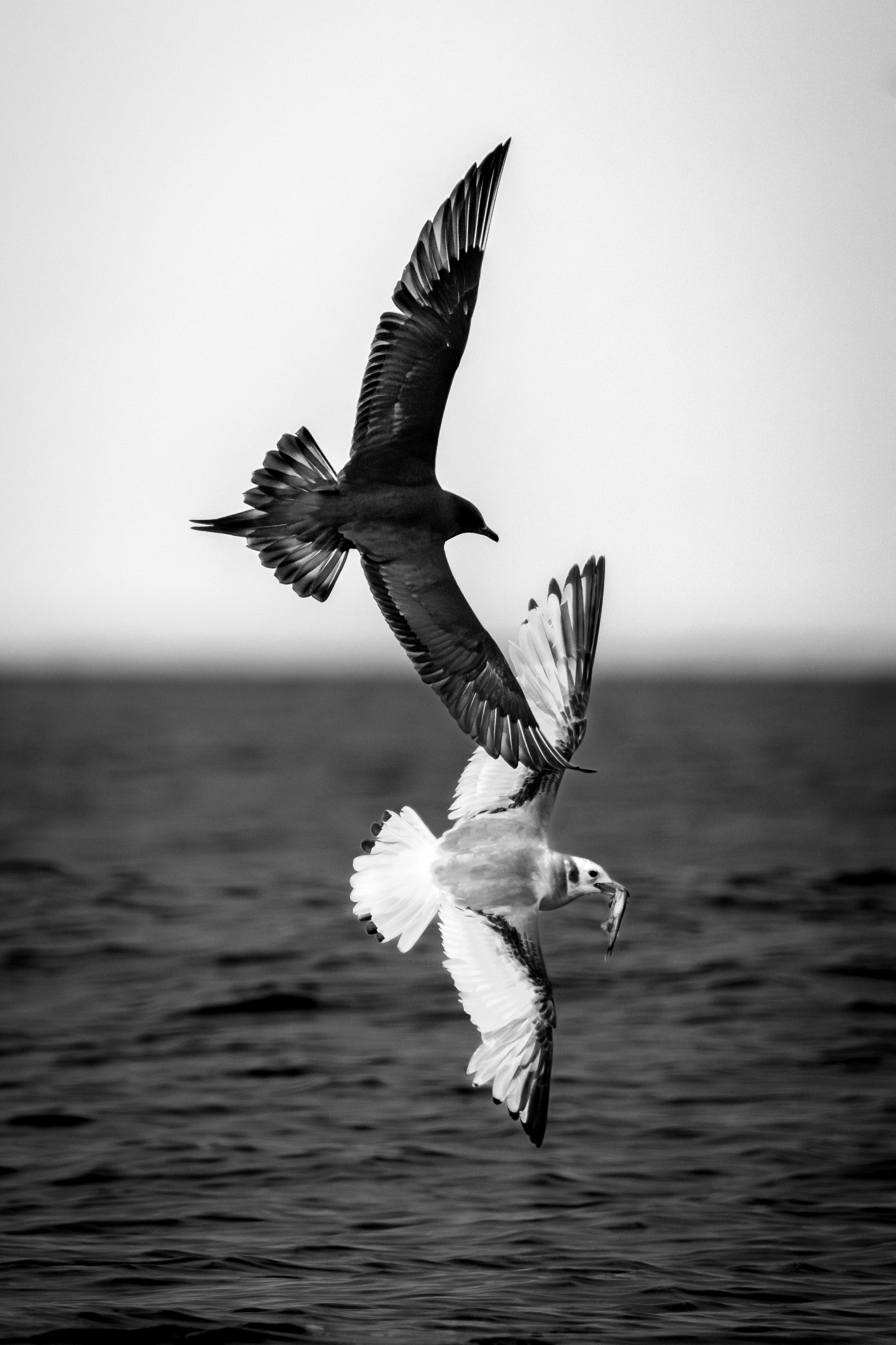 Figure 4. Chasing the fish: An Arctic Skua mimics the flight of a Black-legged Kittiwake to steal its fish. Attribution: Alwin Hardenbol