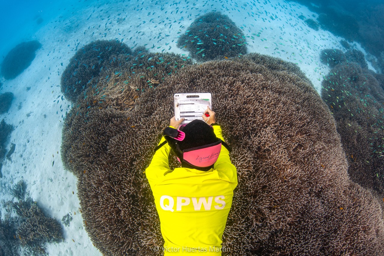 Figure 6: Coral health monitoring at the Great Barrier Reef: A park ranger assesses coral health at Lady Musgrave Reef in the southern Great Barrier Reef.