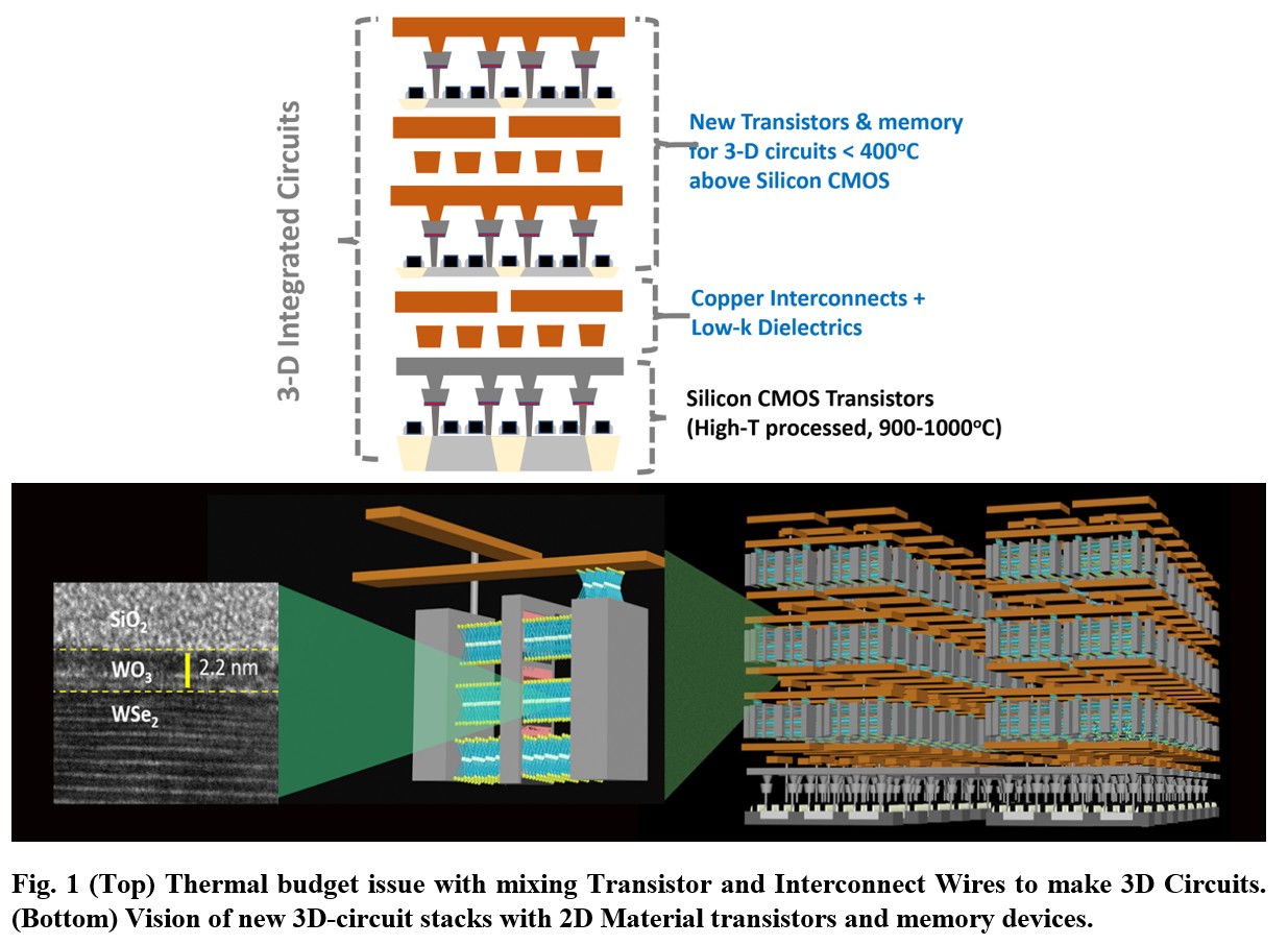 However, to achieve that we must overcome a process roadblock that originated from the time when we moved from Aluminum to Copper on-chip wires, back in the late 90’s. Copper interconnect wires, surrounded by low-dielectric oxides cannot tolerate temperatures above 400oC, else copper atoms extrude into the surrounding dielectrics, compromising the reliability of the wires. Since dopant activation in Silicon typically requires temperatures well above 400oC, we have to build the Silicon devices first, followed by the interconnect metallization and dielectrics (Fig.1 (Top)). Somewhat like baking a layer cake with embedded cream layers. Hence, a cardinal rule of current semiconductor chip process technology is that Silicon and Metal Wires: Thou shalt not mix the two! At least, don’t swap the Front End (transistor) and Back End (interconnect) process order. Making Silicon transistors above the metal interconnect layers for 3-D Silicon circuits compromises the devices and wires. Hence, we are motivated to search for new low-thermal budget beyond-Silicon materials and processes for transistors and memory devices, compatible with the interconnect processing.