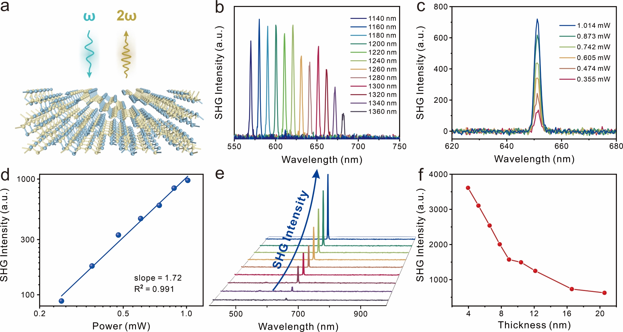 Fig. 3 | Investigation of second harmonic generation (SHG in 2D QLDS-GaTe single crystal. a, Schematic representation of the SHG investigation conducted on the 2D QLDS-GaTe single crystal. Blue arrow refers to the incoming light with a frequency of ω, and yellow arrow refers to the second harmonic generated with a frequency of 2ω. Yellow atoms refer to Te atoms, and blue atoms refer to Ga atoms. b, Wavelength-dependent investigation of SHG intensity under excitation power of 1 mW. c, Dependency of SHG intensity on the excitation power. d, Power-dependent SHG intensity plotted on logarithmic coordinates. e, SHG spectra corresponding to each thickness of the sample. f, Thickness-dependent SHG intensity relationship diagram extracted from Fig. 3e.