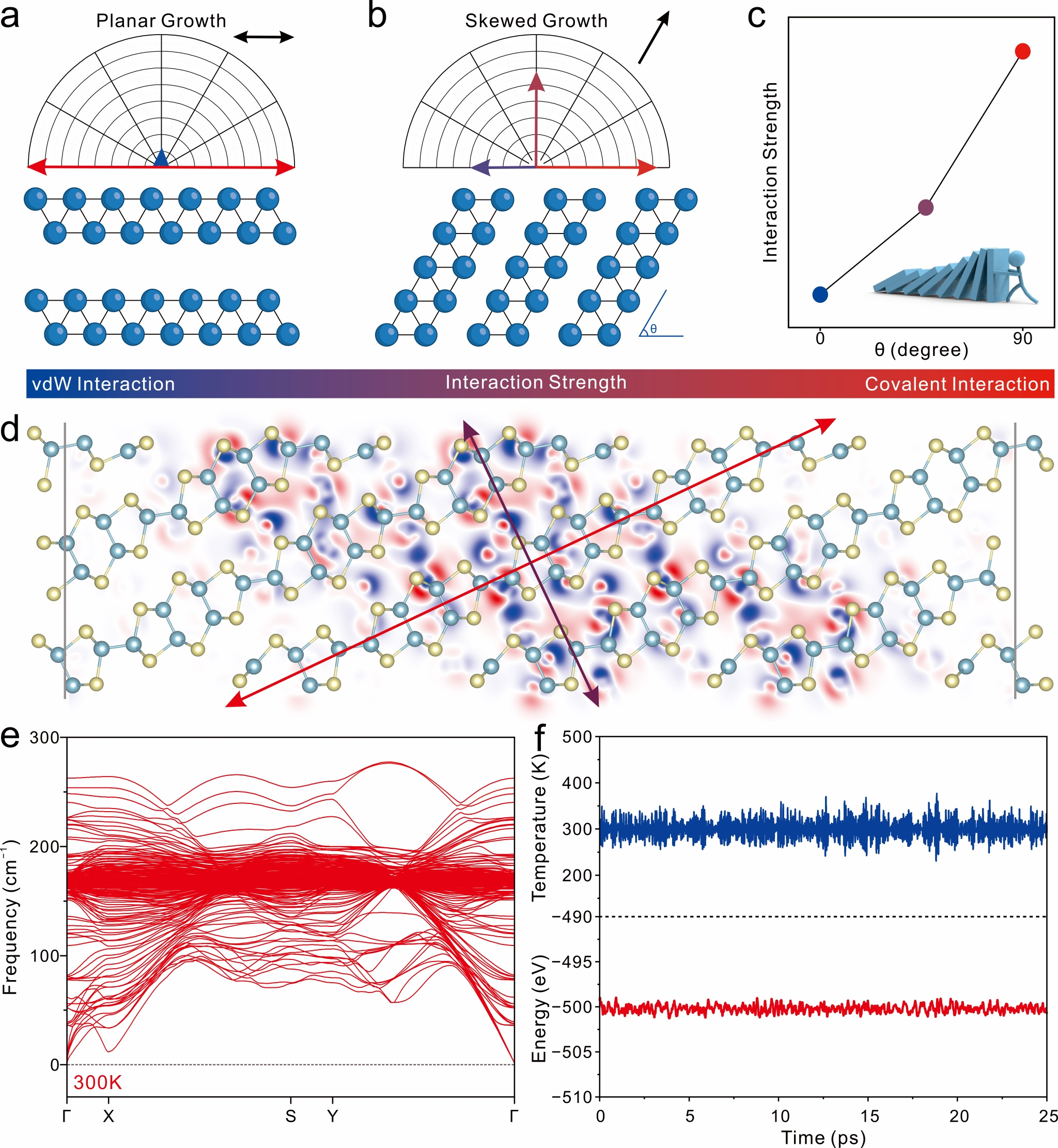 Fig. 1| Interactive-strength-modulation growth strategy and stability of 2D quasi-layered domino-structured gallium telluride (QLDS-GaTe) single crystal. a, Depiction of the interaction and growth orientation of layered GaTe on van der Waals (vdW) substate. b, Illustration of the interaction and growth orientation of QLDS-GaTe on the strong interactive substrate. c, Scheme of skewed angle-related interaction strength perpendicular to the 2D growth plane. d, Calculated contour maps of charge density difference for 2D QLDS-GaTe structure. Electron accumulation (depletion) is shown in red (blue), in accordance with the positive (negative) value below. Yellow atoms refer to Te atoms, and blue atoms refer to Ga atoms. e, Calculated phonon dispersive curves for 2D QLDS-GaTe structure at a temperature of 300 K. f, Temperature and total energy trajectories as derived from molecular dynamics simulations of the 2D QLDS-GaTe structure, conducted at 300 K.