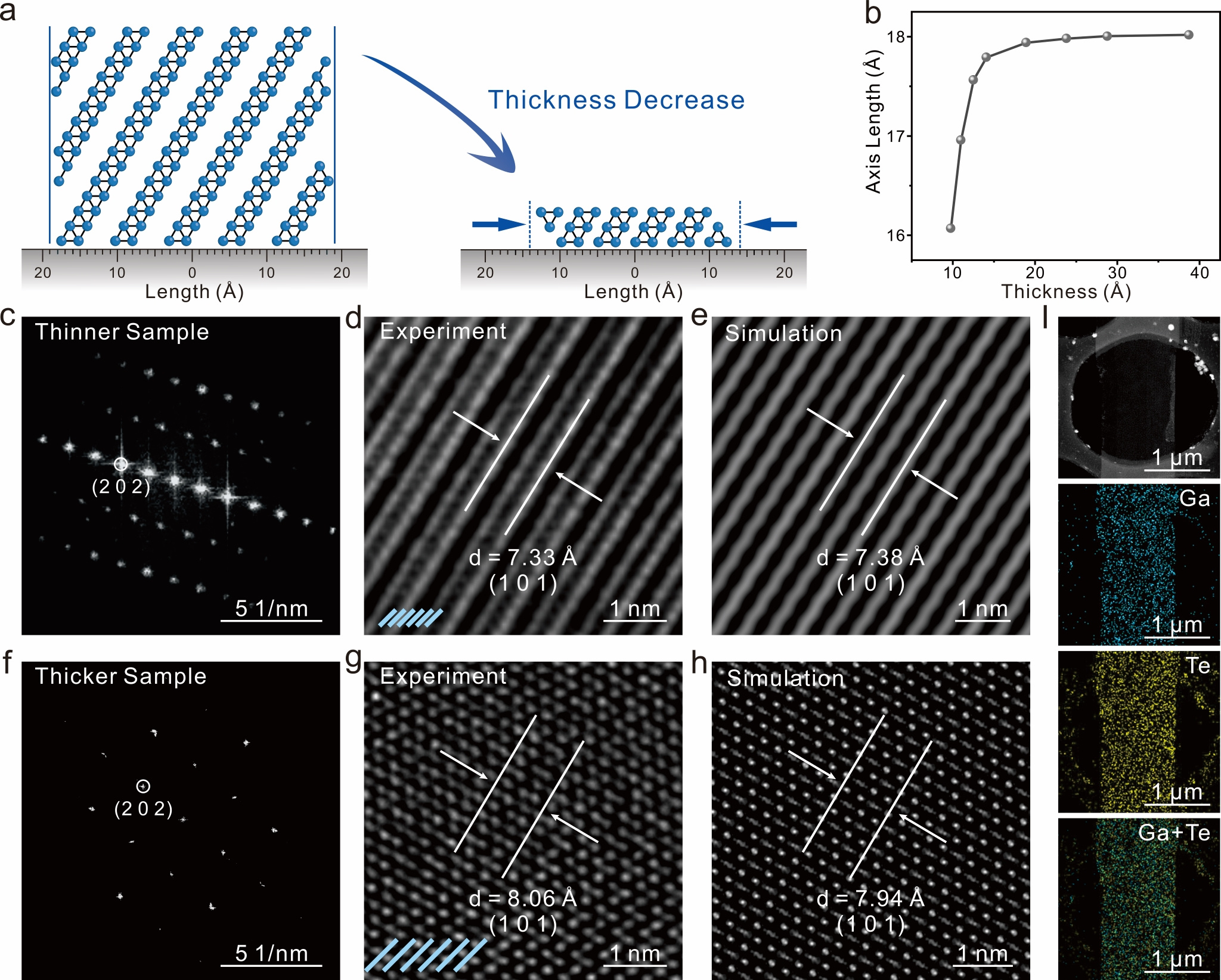 Fig. 2 | Structural characterization of the 2D quasi-layered domino-structured gallium telluride (QLDS-GaTe) single crystal. a, Schematic depiction of the alterations in the lattice constant along the stacking direction following the transition to two-dimensionality in QLDS-GaTe. b, Computed correlation of lattice constant in the stacking direction with respect to thickness. c, Fast Fourier Transform (FFT) pattern derived from a relatively thinner sample of 2D QLDS-GaTe single crystal. d, e, Experimental and corresponding simulated high-resolution transmission electron microscopy (HRTEM) images of the thinner 2D QLDS-GaTe single crystal. f, FFT pattern derived from a comparatively thicker sample of 2D QLDS-GaTe single crystal. g, h, Experimental and corresponding simulated HRTEM images of the thicker 2D QLDS-GaTe single crystal. i, Low-magnification scanning transmission electron microscopy (STEM) image accompanied by corresponding EDS elemental mapping of Ga, Te, and the overlay of Ga and Te elements, observing from the planar perspective.
