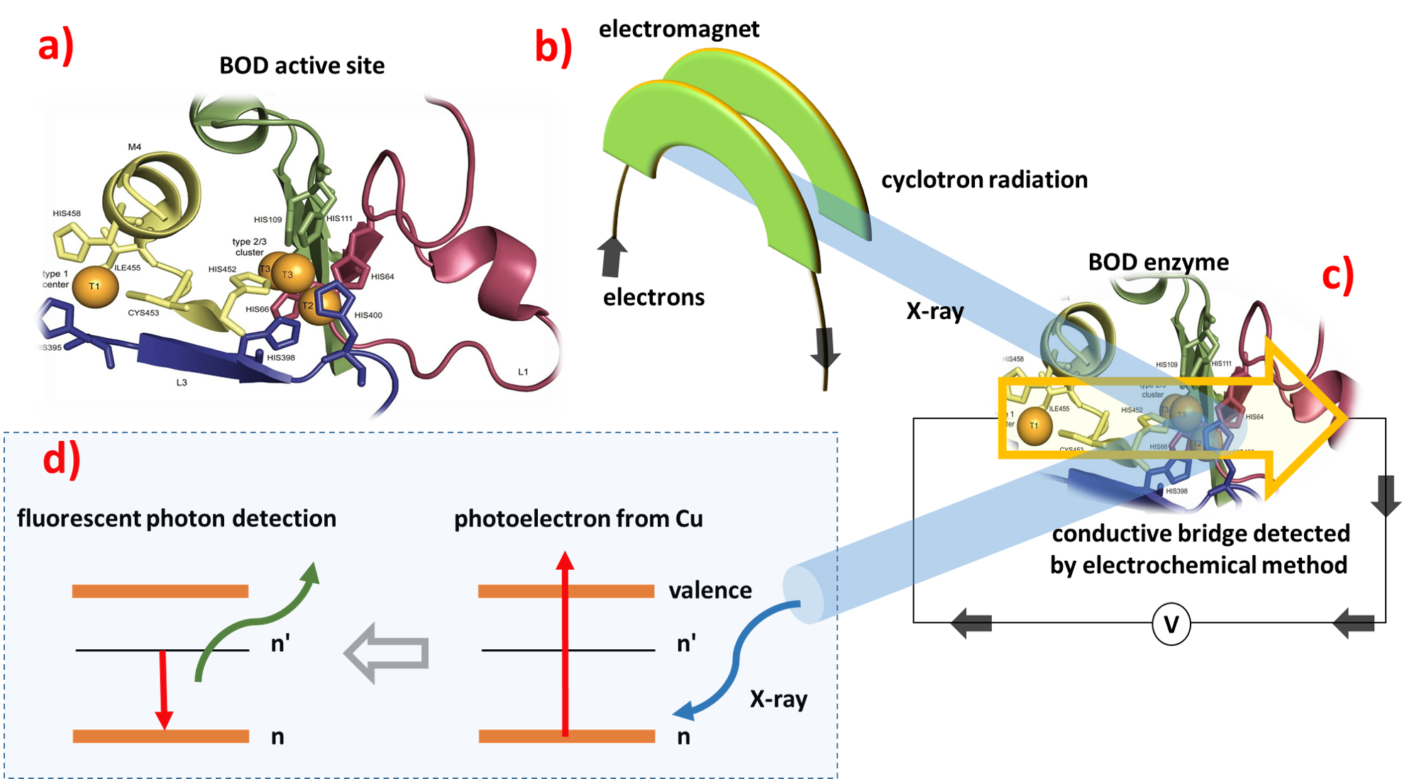 Fig. 1 – Assessing electron transfer reactions and catalysis in multicopper oxidases with operando X-ray absorption spectroscopy. a) Representation of the crystal structure (PDB: 2XLL) with zoom at the four Cu ions within MvBOD. b) Schematic representation of the synchrotron radiation. We have used XAFS2 beamline of Brazilian Synchrotron Light Laboratory (LNLS), a national institution responsible for operating the only synchrotron light source in Latin America. c) XAS spectroelectrochemistry. d) Simplified scheme showing the fundamental processes required to obtain XANES spectra in situ with bioelectrochemistry, with X-ray photoabsorption into a core level followed by photoelectron emission accompanied by fluorescence.
