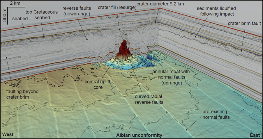 First, the structures deep below the seafloor at the time of impact reveal important details about the direction of the impactor that formed the crater. We can now image the central uplift, where the rock is weakened by the impact process to the point where it temporarily flows like a fluid and moves vertically back up into the transient (initial, bowl-shaped) crater (Fig. 3B), in detail and confirm that its dimensions are what we would expect for a crater of this size. The outer margin of this uplift and the edge of the surrounding moat, display radial reverse faults, that show that the rocks below the crater were thrust to the west immediately after impact. This, together with some other distinct fault patterns, show that the asteroid or comet that formed the crater hit the seabed at a shallow angle from the east.