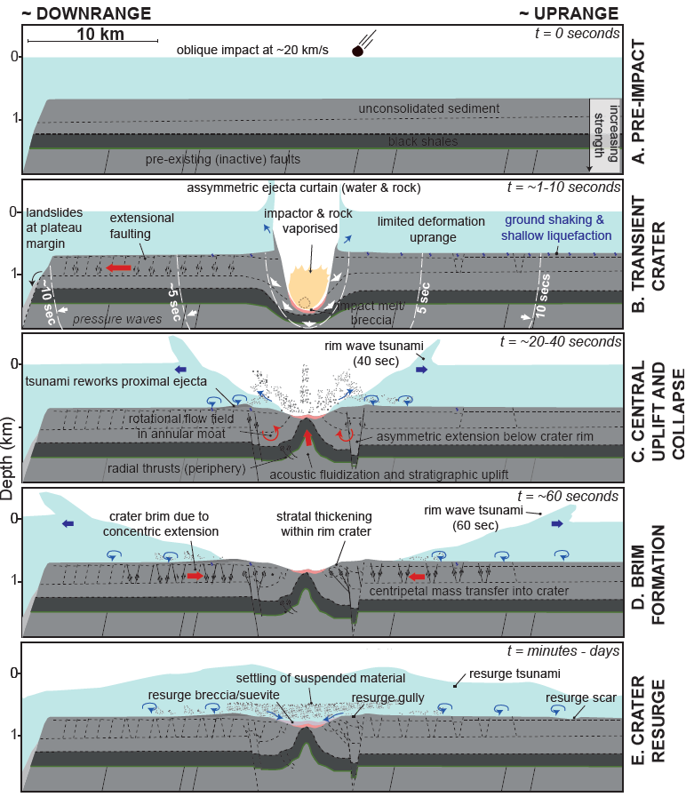 Finally, detailed maps of the seabed at the time the crater formed show that there are large, arcuate scars around the crater, that we think formed during the ‘resurge’ stage (Fig. 3E). Given that the water depth in this location at the end of the Cretaceous period was around 500 to 800 m deep, this means that the water that surged back into the crater (after the initial outward-propagating tsunamis), was sufficiently turbulent and chaotic to strip tens of metres of sediment off the seabed.