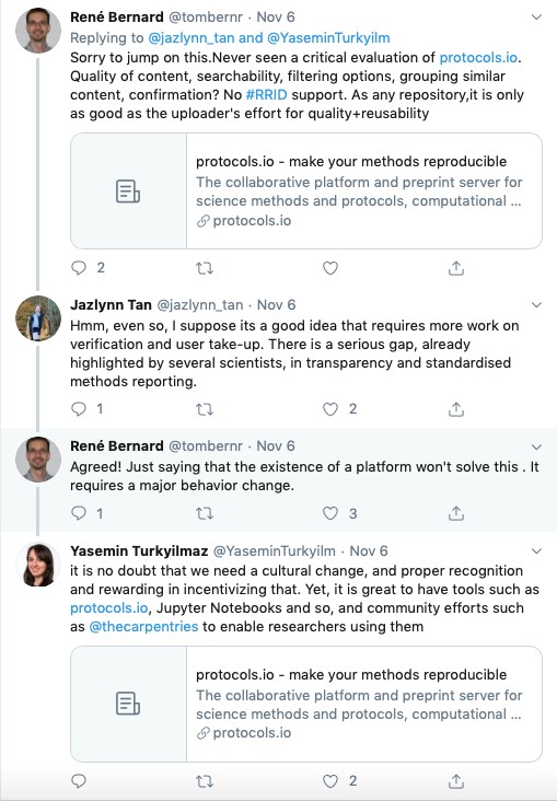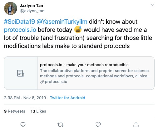 A discussion ensued on Twitter (check out #SciData19 for more!) regarding the reliability of protocols.io. The reliability and legitimacy of the repository relies on the integrity of its users. Ultimately, we need a cultural shift – scientists that are data-literate and share the same passion towards open science.