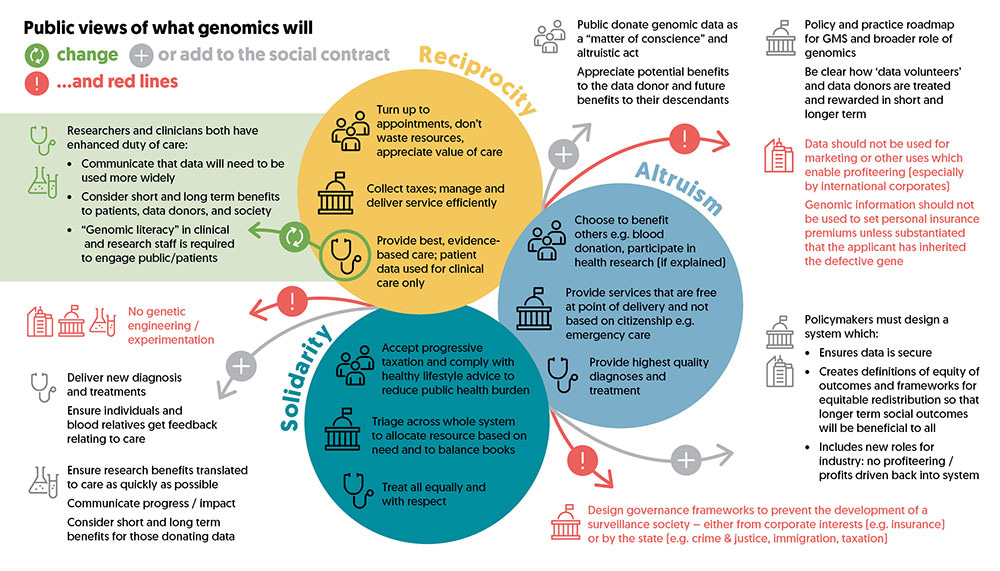 The findings can all be analysed in detail on the Ipsos MORI website, and they are centred around the concept that support for genomic medicine is based on the values of reciprocity (a deal between the public and researchers), altruism (sharing your data to benefit others), and solidarity (reducing the overall public health burden). The graphic below usefully shows some key findings.