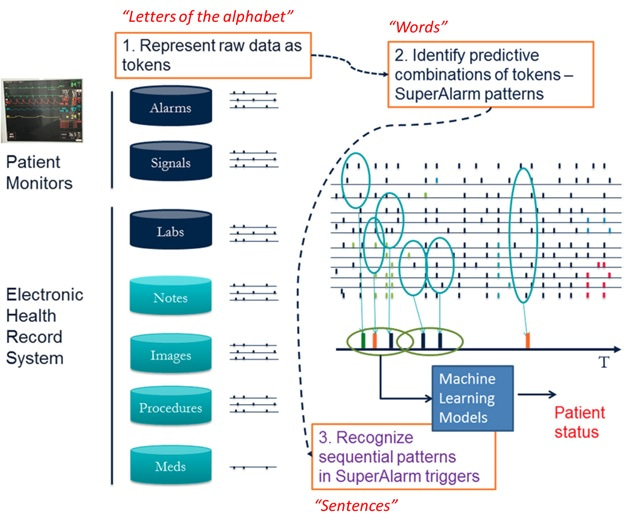 We reimagine the alarm system in a linguistic manner, where many alerts (what we know of as individual alarms in current day system) that frequently coexist are combined to form “words”; we call these SuperAlarms (In this manner, non-critical alerts that occur in isolation, are likely false and therefore suppressed). We then combine these “words” into “sentences” (sequences of SuperAlarms) through a data-driven and clinically validated approach to best describe (and warn of) specific patient deterioration events. These specific sequences of SuperAlarms can be further reviewed and verified by clinicians to justify further workup and treatment.