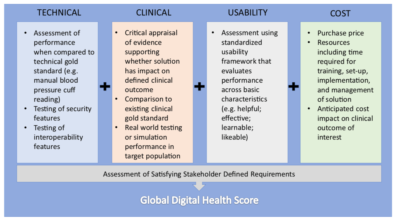 The motivation for designing a validation framework for digital health was inspired by the real world challenge of not being able to reliably give patients and colleagues recommendations for which health technologies to use. This limitation is due to difficulty in identifying quality in a crowded marketplace of solutions. In traditional clinical medicine, there are generally agreed upon conventions on what constitutes high quality evidence which are used to discriminate traditional devices and therapies. This clarity is what ultimately changes clinical practice. In the world of consumer goods there are also number of trusted entities that help convey quality through rigorous testing. Digital health represents an overlap of these two worlds where products are marketed directly to patients and physicians with clinical intent, but unfortunately without any meaningful oversight. Our approach was to develop a pragmatic and transparent scorecard to evaluate health technology to help all stakeholders in medicine identify the solutions that can make a difference. We designed our framework of evaluation along four principal domains: clinical validation; technical validation; usability; and cost. In addition, an evaluation of whether the technology satisfied its end user's functional requirements was also included.
