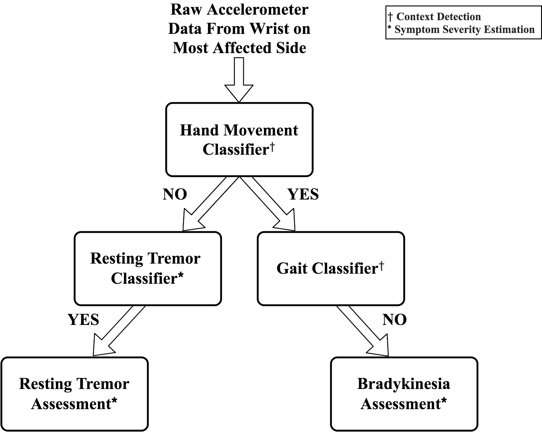 We took a pragmatic approach for algorithm development; using machine learning for more complex tasks (e.g. tremor and gait detection) and heuristic, rule-based algorithms for simpler tasks (e.g. hand movement detection). The system utilizes a hierarchical approach for sequentially processing raw sensor data by first performing context detection (hand movement and gait detection) followed by assessment of motor symptoms (resting tremor and bradykinesia). The motivation behind using this architecture was to provide more interpretable, context-specific measurements during ambulatory monitoring.