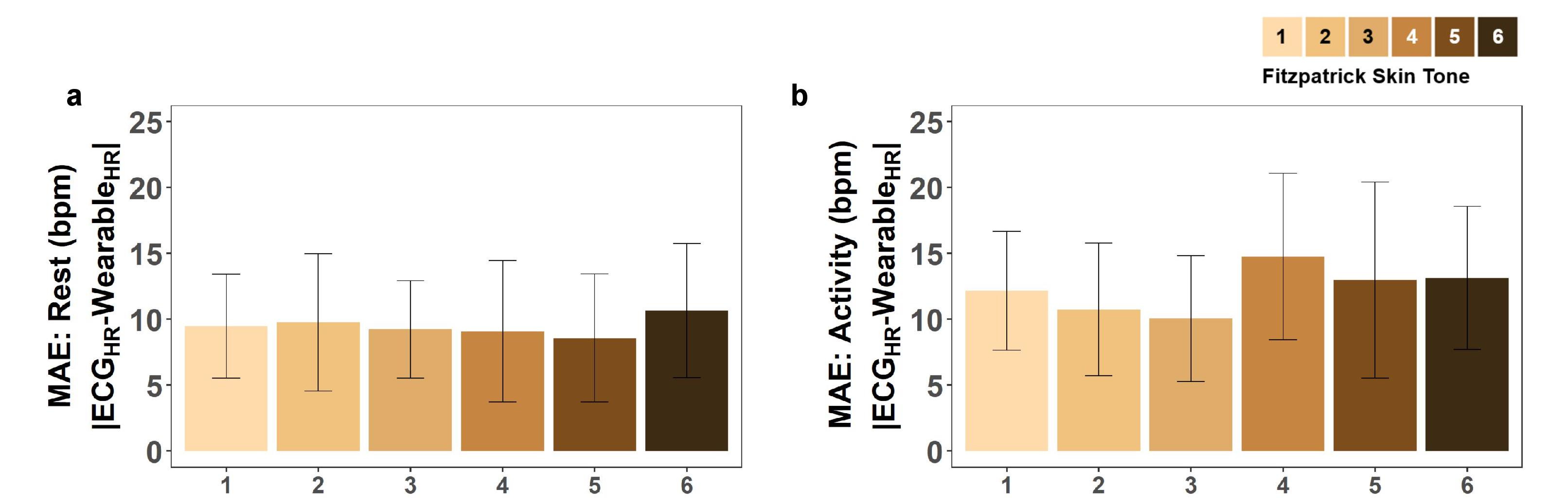 Figure 2. Error in Heart Rate across Skin Tones and Devices at Rest and During Activity. Mean Absolute Error in heart rate (bpm) across skin tones and devices at (a) rest and (b) during physical activity. Error is calculated as the difference between the ECG and wearable reported heart rate at every simultaneous measurement. Fitzpatrick skin tones 1-6 are represented with an approximately equal number of participants in each skin tone. Error bars represent the 95% confidence interval