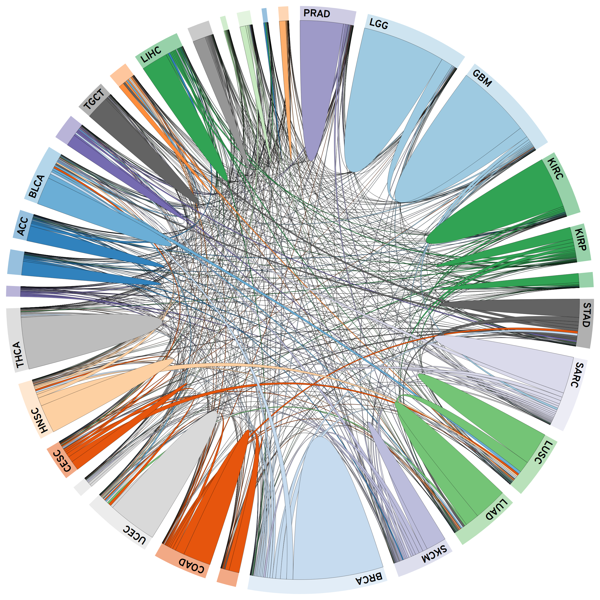 Figure 1: Chord diagram showing inter-connections between different cancer sub-types. Interactive version can be found here.