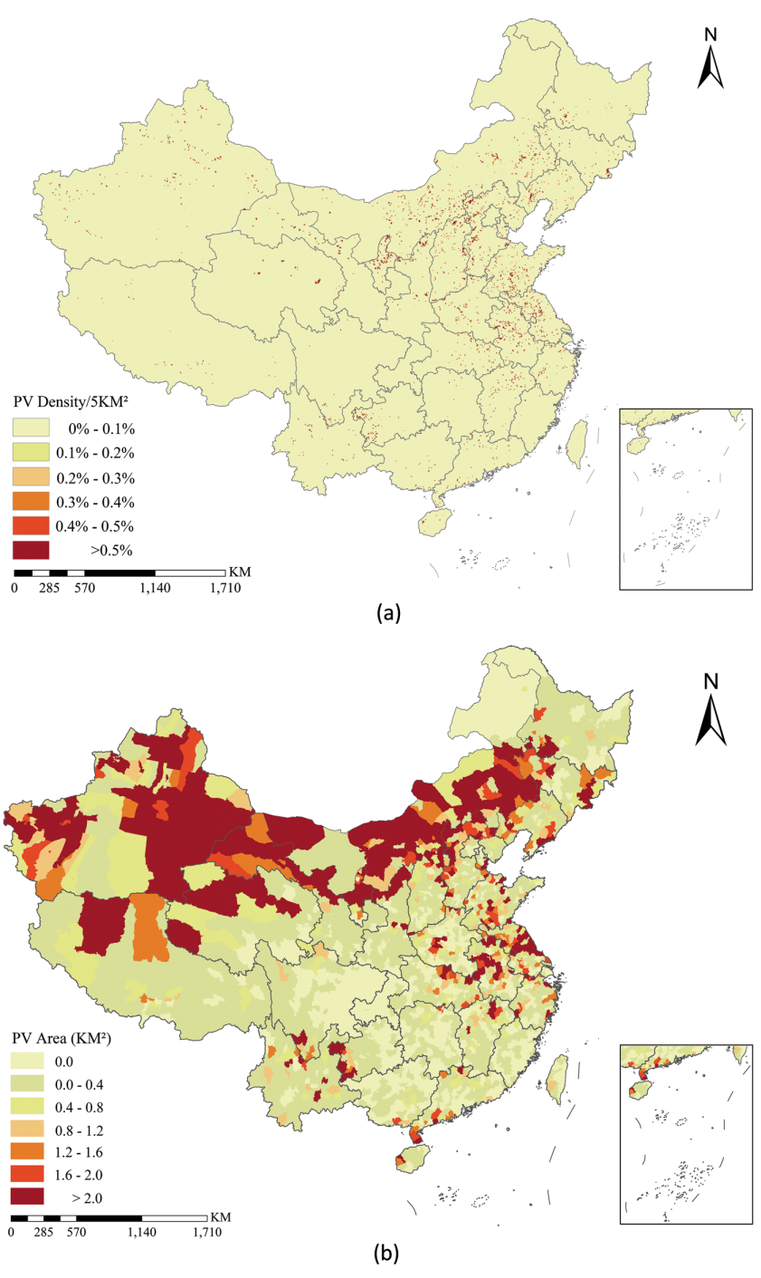 Fig. 2 (a) PV power stations density map across China; (b) PV power stations area map for each county of China.