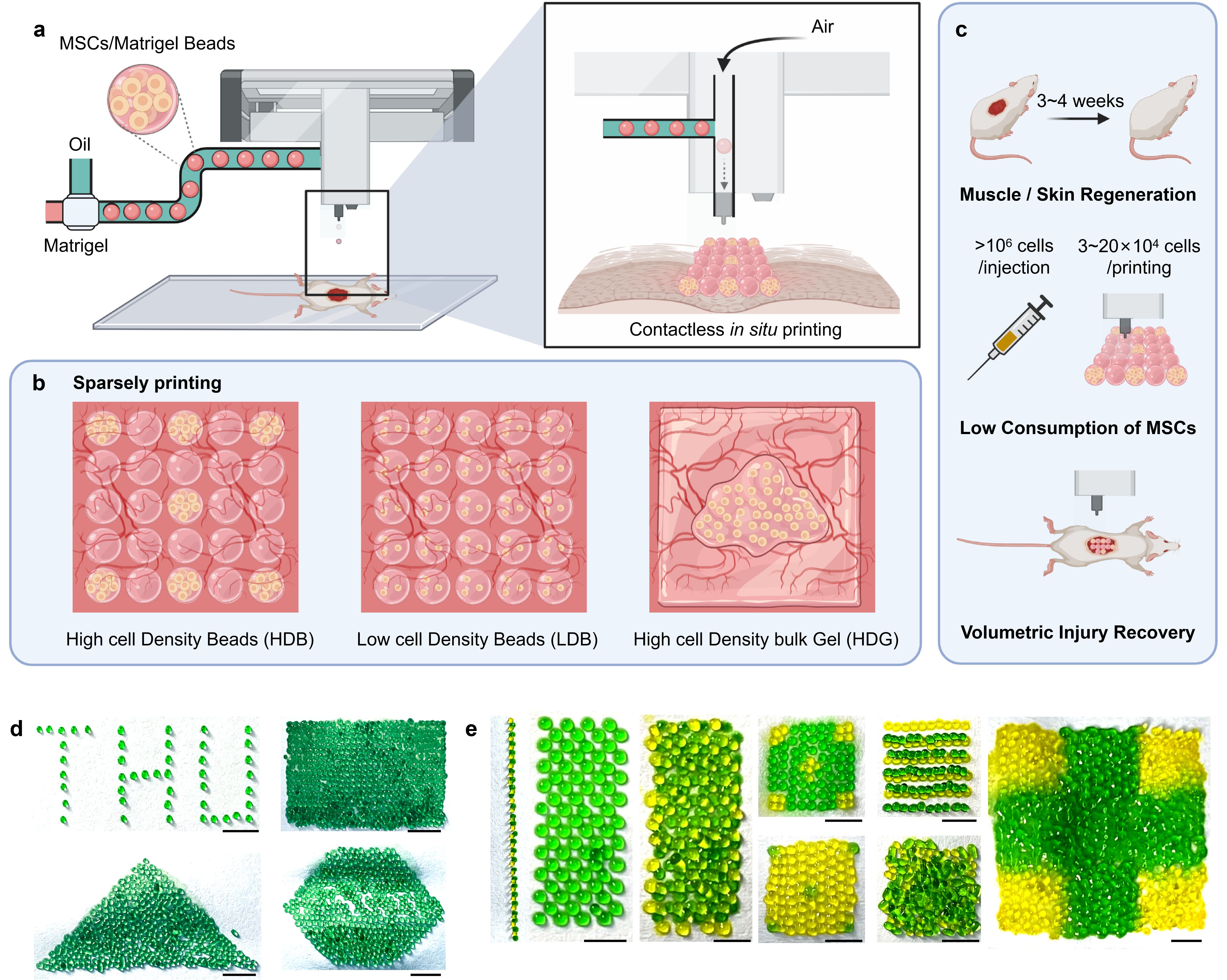 Stem cell therapy is becoming a prevalent and promising technology in regenerative medicine. However, there are many unresolved problems toward clinical translation. Low retention rates of transplanted cells and poor long-term survival are among the top challenges5,6. That’s the main reason for us to develop the first gel microbeads-based printing for live cells with high-throughput capacity (Figure 1).
