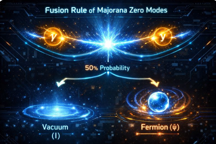 When two MZMs are brought together and fused, the outcome is not unique. Instead, there are multiple possible fusion channels, meaning the system can end up in different quantum states, a rule written as γ ×γ = I +Ψ. As long as the MZMs remain spatially separated, these possibilities coexist, giving rise to a set of degenerate ground states. Importantly, this information is not stored at any single location—it is shared nonlocally across the system.