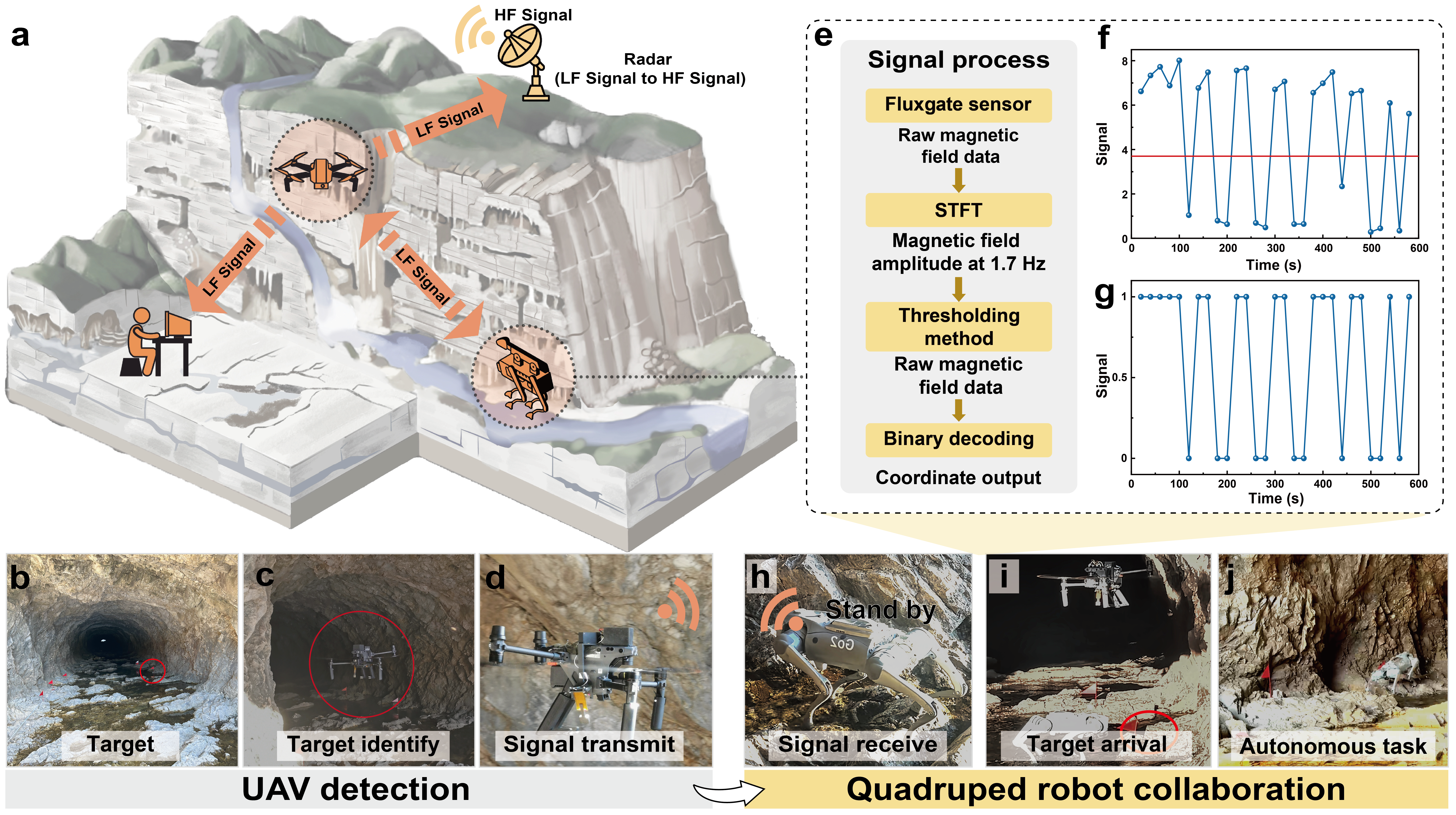 We built a field demonstration in a natural cave environment. A UAV (DJI Matrice 30) carried the antenna and drive electronics. The UAV identified target markers inside the cave and transmitted encoded coordinate information to a quadruped robot (Unitree Go2) positioned outside. On the receiver side, the system extracted the carrier component and used short-time Fourier transform (STFT) analysis and a simple threshold decision to decode binary symbols. The quadruped then navigated using the decoded coordinates and reunited with the UAV within about one minute in the demonstrated case.