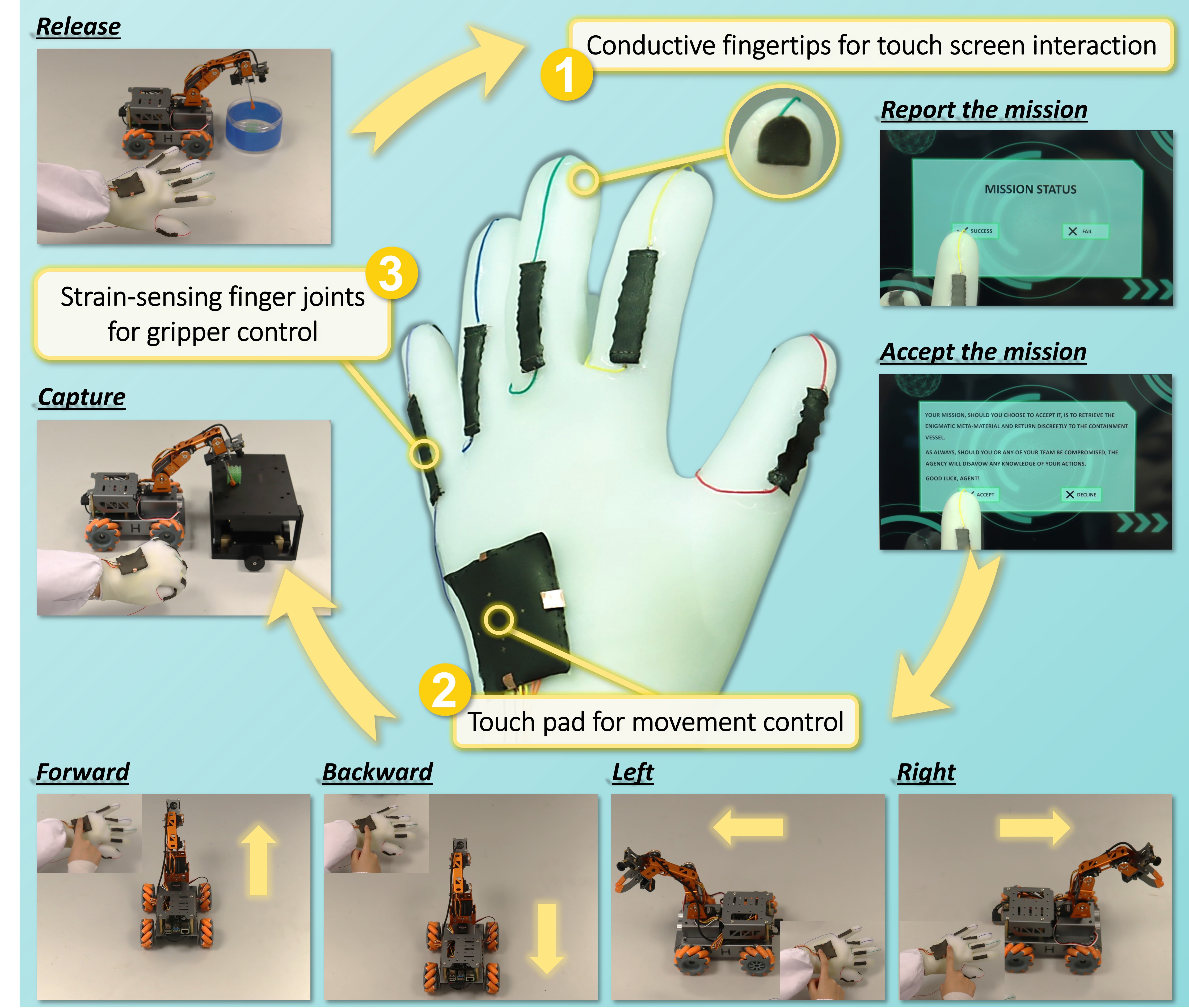 Fig. 6 Demonstration of a multi-functional smart sensing glove that integrates conductive fingertips, touch pad, and strain sensors using the composite organo-hydrogels for touch screen interaction and robotics control.