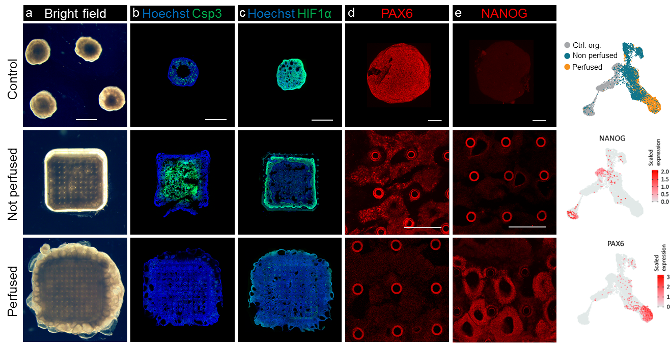 Figure 3 Perfusion prevents apoptosis and accelerates differentiation in neural constructs. a Bright field images of organoids, non-perfused and perfused constructs. b Immunofluorescent images of apoptotic marker cleaved Caspase 3 (green). c Hypoxia marker HIF1α (green). d Early neural marker PAX6. e Stem cell marker NANOG. f UMAP plots of the combined dataset highlighting locations of PAX6 and NANOG expressing cells in the UMAP space. a-c Scale bar 1mm. d, e Scale bar 250µm