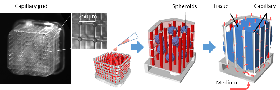 Figure 2 Capillary grid design and tissue generation strategy. From left to right: photograph of the empty “perfusion basket” (capillary grid); a CAD model of the grid with capillaries shown in red; the grid seeded with spheroids (blue) suspended in Matrigel (pink); after several days of perfusion a cohesive tissue is formed, flow direction shown with red arrows