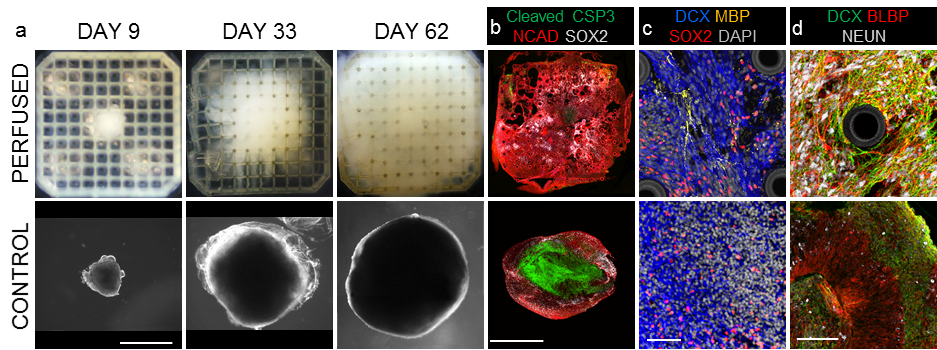 Figure 4 Perfusion of cortical organoids. a Bright field images of perfused organoids growing in grids (top row) and control organoids in floating culture. b Immunofluorescent images demonstrating viability and enhanced phenotypical features of perfused organoids. Cleaved Caspase 3 (green) indicates apoptotic cores in control organoids, while healthy tissue shows neuronal identity (N-Cadherin, red, SOX2, white). c Perfused organoids exclusively express myelin basic protein (MBP, yellow), marker of mature oligodendrocytes, migratory cortical neuron marker Doublecortin (DCX, blue). c Staining for radial glia, BLBP (red) and DCX (green), demonstrate a neuropil-like structure in perfused organoids formed by dense and intertwined networks of radial glia and neuronal processes, including a populations of mature neurons (NeuN, white), while in control organoids the cellular arborization is almost absent. a, b Scale bar 1mm. c, d Scale bar 70µm
