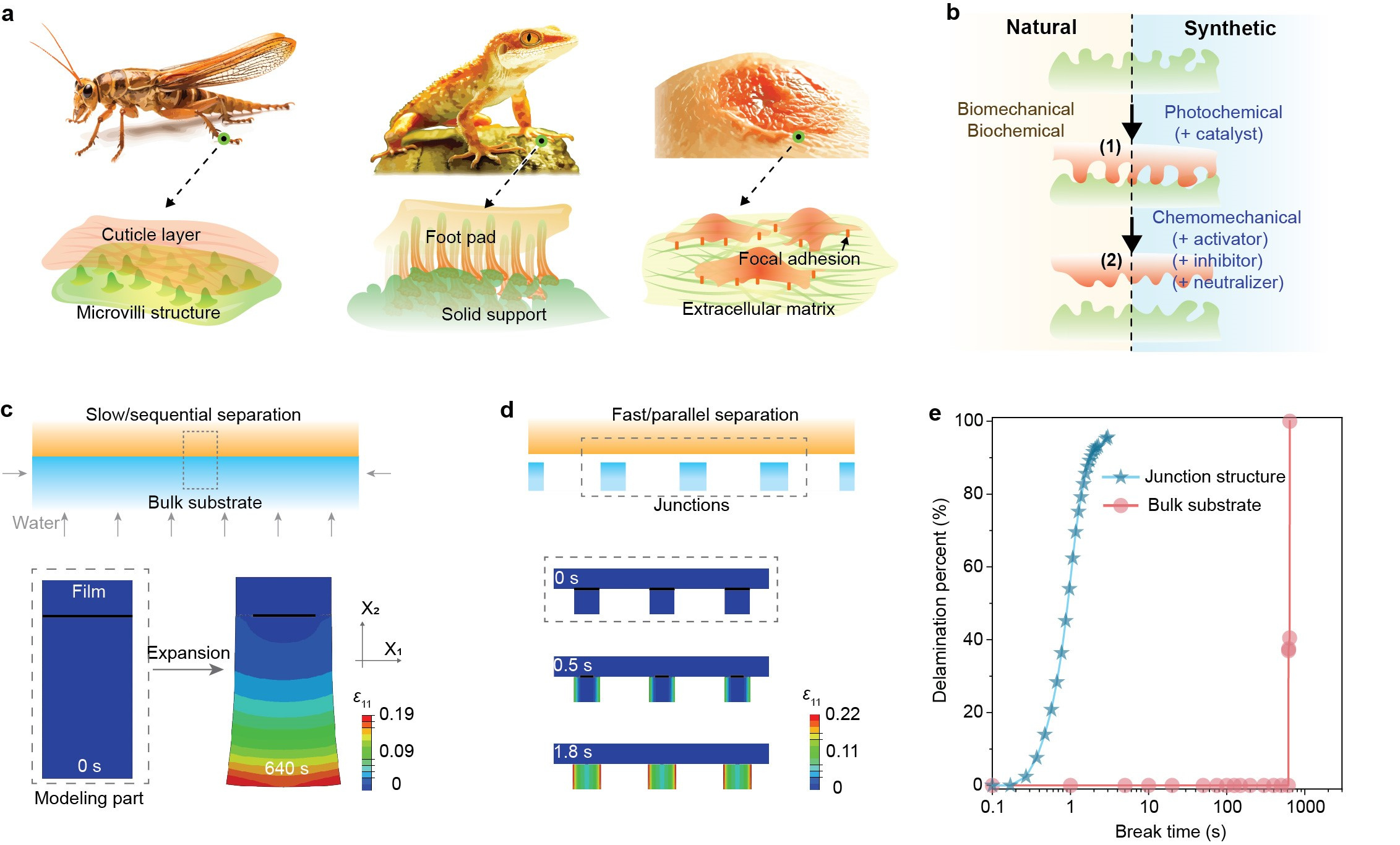 There appears to be a delicate balance between the structure and the delamination properties. Delving deeper into the mechanisms, we found a similarity between the microstructure of our substrates—whether aerogel or paper—and the footpads of geckos, which can adhere tightly to surfaces while moving swiftly when needed. In collaboration with Prof. Lihua Jin and Dr. Wei Chen from UCLA, we thoroughly calculated how the micropillar structure accelerates the delamination speed. Their calculations helped us visualize the separation process, which cannot be observed with experimental methodologies. Building on this method, we proposed using nanocellulose fibers for traditional microfabrication, significantly enhancing the delamination speed by approximately 1 order of magnitude. This structure-property relationship deepens our understanding of interfacial phenomena in microfabrication and subsequent processing. The universality of our platform also highlights its potential for generating devices with tailored properties for specific applications.