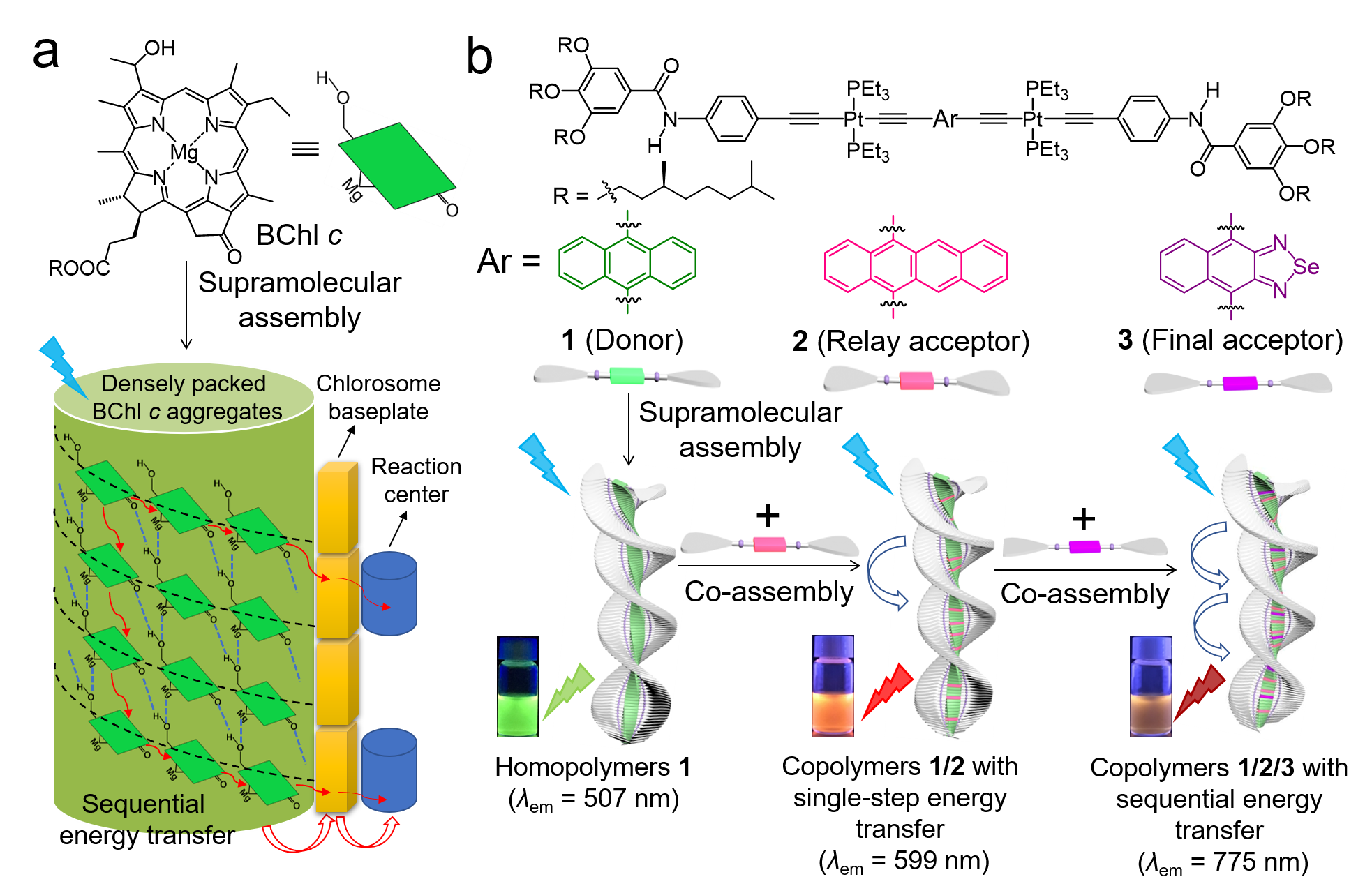 Figure 2. (a) Direct supramolecular self-aggregation of bacteriochlorophyll c (BChl c) into light harvesting antenna, together with sequential energy transfer in green photosynthetic bacteria. (b) Supramolecular copolymerization of 1–3 (cartoon symbols with green, pink, and purple color) with sequential energy transfer behaviors.