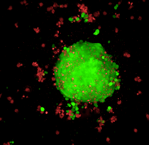 Human T-cells (red) penetrating a 3D colorectal cancer tumor spheroid expressing EGFP (green) in a well of a 1536-well plate. The whole model fits on the head of a pin and enables large compound screening campaigns to find new drugs that augment T-cell-mediated tumor killing.