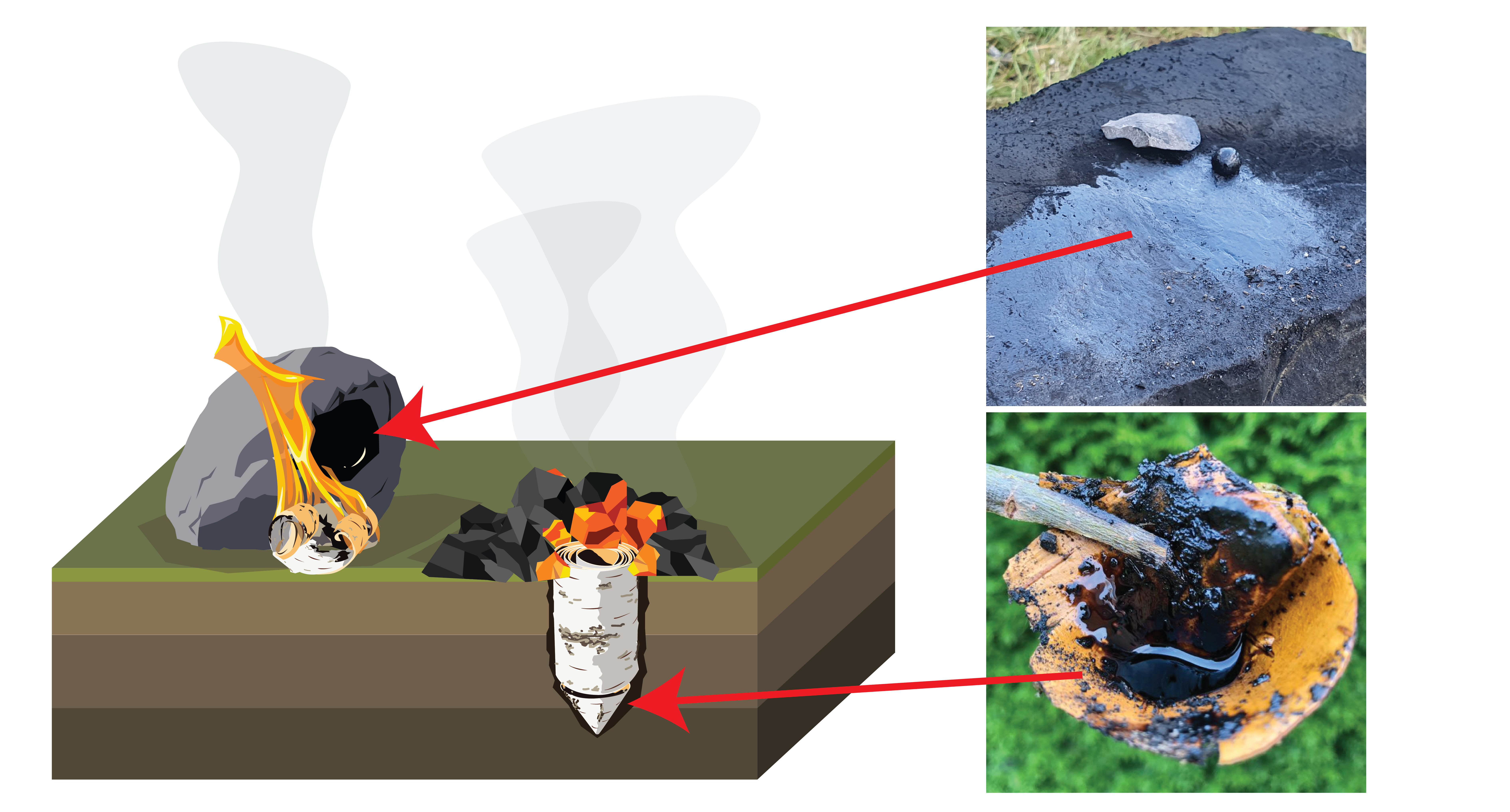 To understand how tar was made, archaeologists must look at clues within the tar itself. Using Gas Chromatography-Mass Spectrometry (GC-MS), specific chemical compounds, or 'biomarkers' are usually used to identify the source of organic residues on stone tools. Fats and oils, resins and tars all have unique chemical fingerprints depending on their source. These biomarkers may also be altered by both natural and artificial forces. This provides the possibility of reconstructing long lost details such as heating temperature and duration, or the availability of oxygen during production. For example, tars made above ground were likely exposed to heat for less time, but with more oxygen than tars made below ground (Fig. 2). They should therefore have unique biomolecular compositions.
