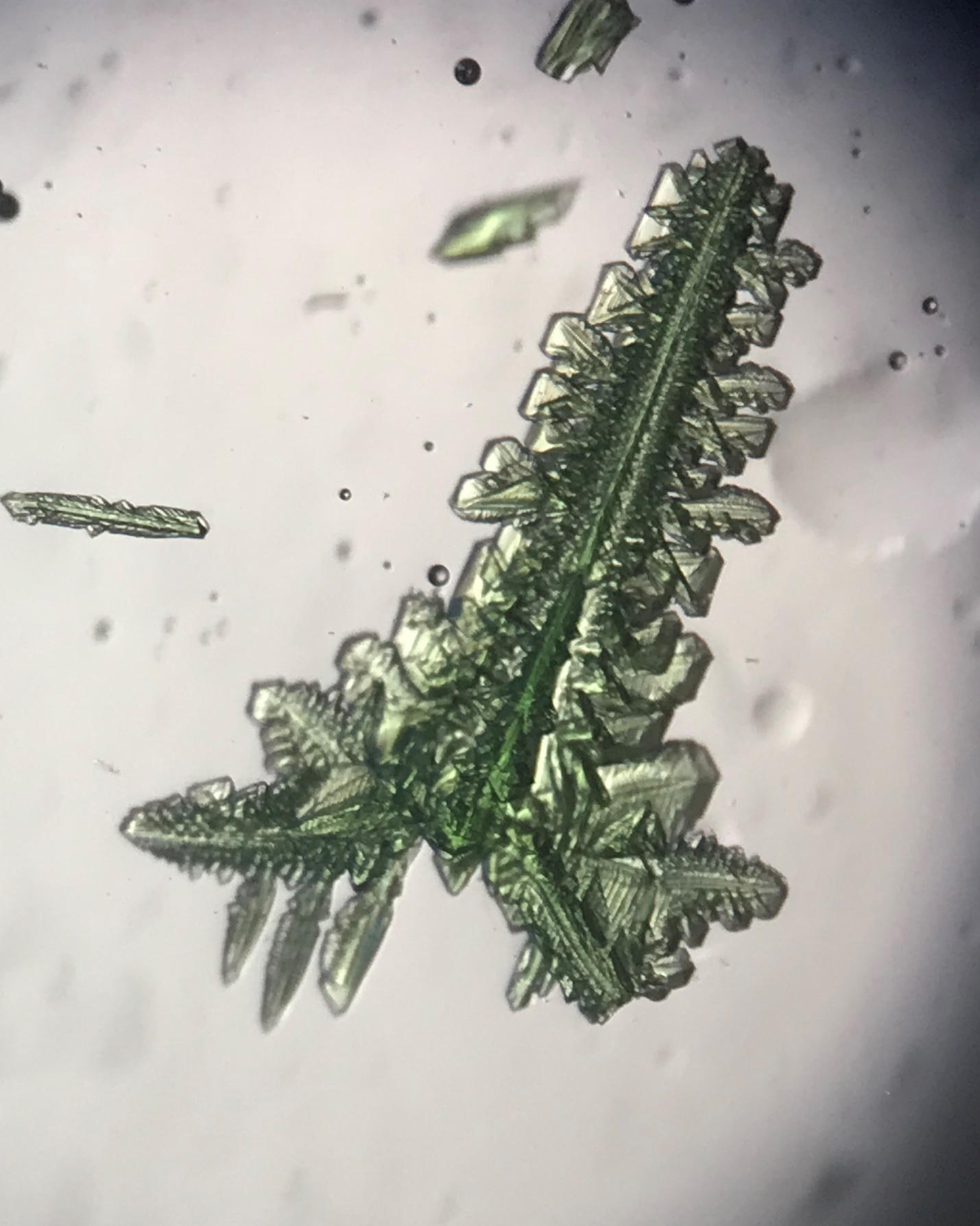 A polycrystalline californium sample grown in the shape of a pine tree on the scale of 100 μm