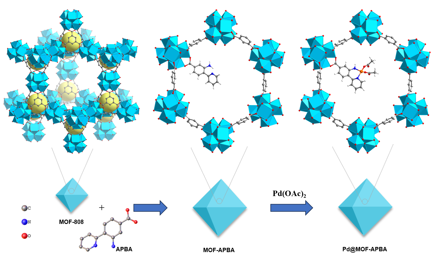 We characterized Pd@MOF-APBA using XRD, ICP, SEM, TEM, XPS, and XAS. To further elucidate its structure and catalytic activity, we also synthesized Pd@MOF-808, PdCl2@MOF-APBA, and Pd@MOF-BCA for comparison. The results demonstrated that the chelation of N, N'-bidentate ligands in Pd@MOF-APBA effectively immobilizes the palladium catalytic centers within MOF-808, postponing palladium leaching and agglomeration while maintaining high catalytic activity. Additionally, N2 adsorption-desorption isotherms confirmed that the ample pore size of MOF-808 can accommodate both APBA and palladium centers, providing sufficient space for catalytic reactions.