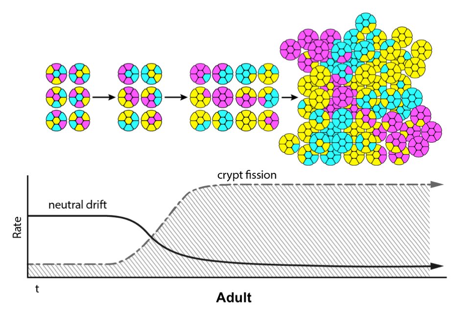 Crainbow mouse models could be useful in many ways – one could study tumor heterogeneity, visualize metastasis, or compare oncogenic potential. We decided in this first paper to use Crainbow for studying how somatic mutations acquired in the intestinal stem cell spread throughout the epithelium. We initially chose the intestine for our work – other organs and cancers are being studied currently – because of the well-documented activity of intestinal stem cells residing at the crypt base. Crainbow was used to empirically show that the lateral spread (i.e. the spread of mutations from one crypt stem cell into neighboring crypts) was very inefficient. Even potent oncogenes, like ßcatenin, were unable to significantly spread laterally in adults. A surprising finding was that somatic mutations rapidly spread during postnatal development –a critical period in which crypts are more dynamic than in adults. This finding suggests that colorectal carcinogenesis may be seeded during the first few years of life. Lastly, we found a new functional role for the oncogenic fusions of Rspondin-3 as drivers of somatic spreading – even in adults. This appears to occur by increasing crypt fission and reducing the neutral drift behavior of intestinal crypts, a process we term “microenvironmental oncogenesis” because it extrinsically modifies stem cell behavior.