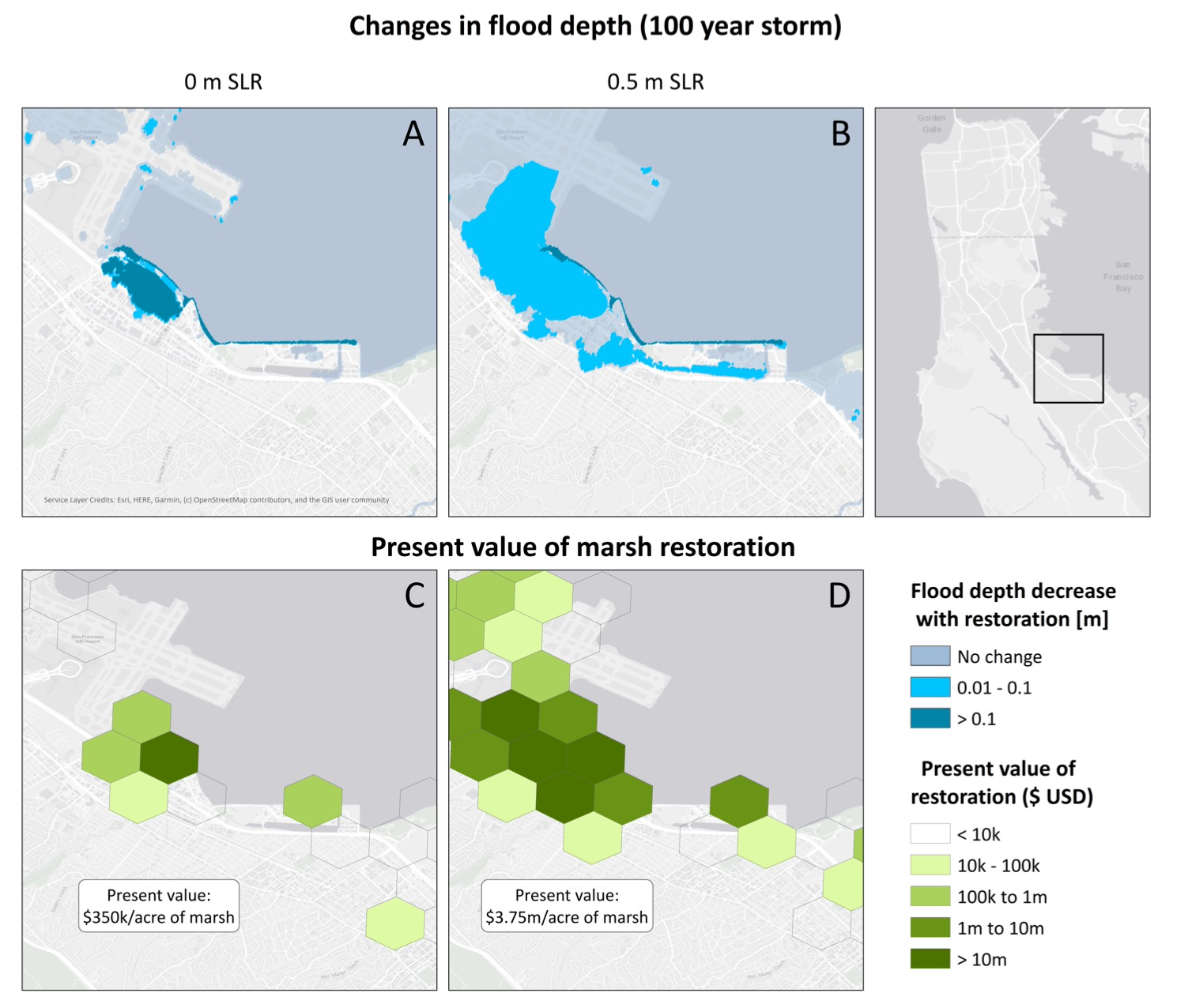Marsh restoration does not reduce flood risk evenly across the landscape—some locations in San Mateo County would benefit more than others, as demonstrated by the restoration scenario south of the San Francisco International Airport, which would provide an estimated $350 k/year in benefits with current sea level, a benefit which would increase tenfold with half a meter of sea level rise. The detailed flood model developed in this study evaluates the risk of flooding with and without salt marshes at a local scale, a tool that can be highly useful for the planning and design phases of marsh restoration projects in San Mateo County.