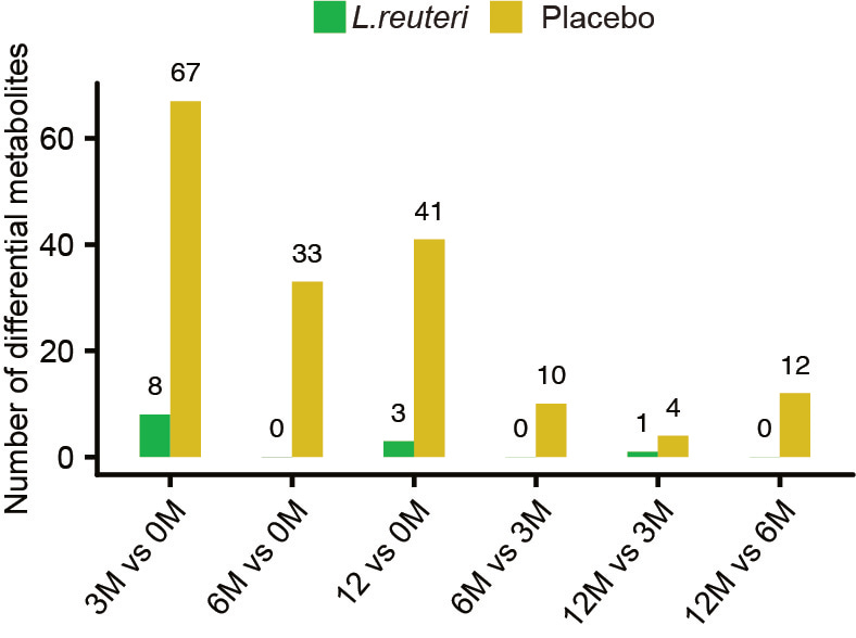 Figure 2. Metabolic alterations in older women supplemented with placebo or L. reuteri ATCC PTA 6475. Numbers of significantly differential metabolites between time points in the L. reuteri group or placebo group (adjusted P < 0.1).