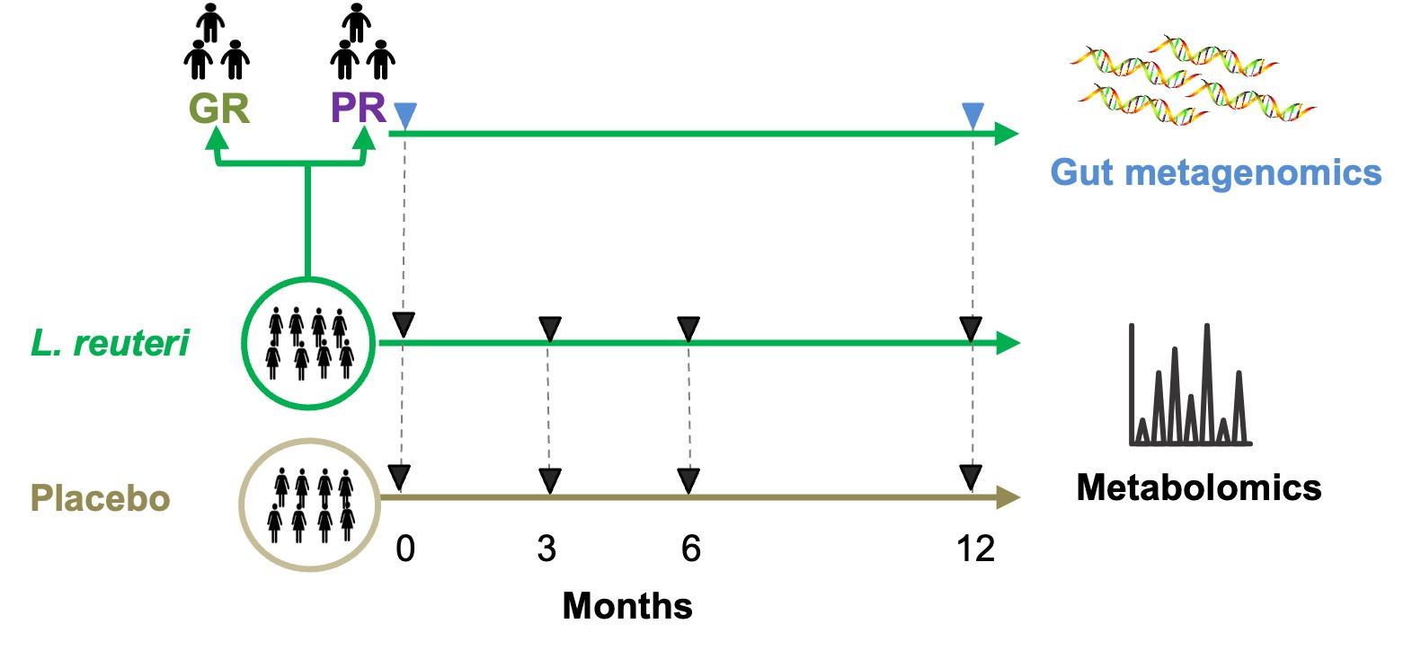 Figure 1. Experimental design for the effect of L. reuteri ATCC PTA 6475 on bone metabolism in older women. Serum samples for metabolomic profiling were collected from older women with low BMD at baseline, 3, 6, and 12 months in our previous study 2. Fecal samples for metagenomic profiling were collected from good responders (GR) and poor responders (PR) at baseline and 12 months in the present study.