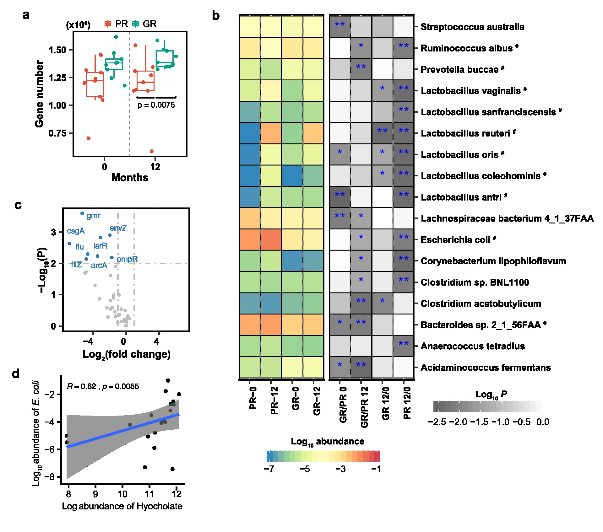 To this end, in the present study, Jens Nielsen’s team further investigated the effects of L. reuteri ATCC PTA 6475 on the gut microbiome of older women with good or poor responses to the probiotic intake, where fecal samples were collected at baseline and 12 months (Figure 1, doi: 10.1038/s41522-022-00348-2). After one-year supplementation with L. reuteri ATCC PTA 6475, the significantly increased gene richness of the gut microbiota in the good responders was revealed (Figure 3a). In total, 16 differential species between the two groups or between the two time points were identified (Figure 3b). Also, difference in the metabolism related to biofilm formation (E. coli) between the GR and PR groups at 12 months were observed (P < 0.05). The genes including arcA, gmr, csgA and envZ involved in biofilm formation, were more abundant in the PR group than the GR group after one-year treatment (Fig. 3c). Particularly, metabolite hyocholate showed a positive correlation with species E. coli at 12 months (Fig. 4d).