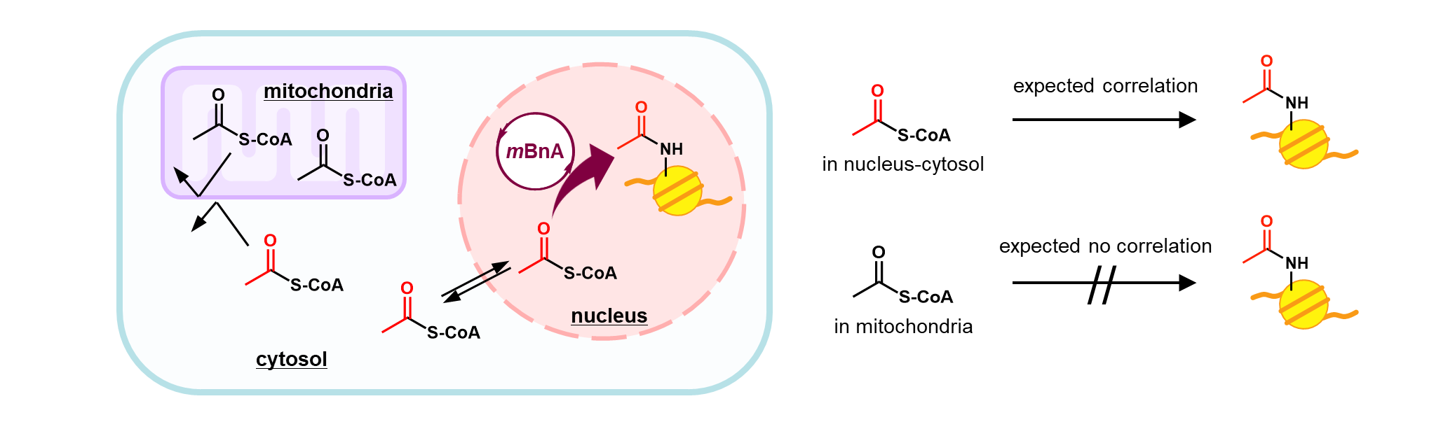 To show that mBnA is a "useable" catalyst, we explored further applications. The ability of mBnA to utilize intracellular Ac-CoA, especially in the nuclear-cytosolic compartment where histones are present, led us to focus on its potential as a chemical probe to detect changes in the nuclear-cytosolic Ac-CoA concentration via histone acetylation. In experiments aimed at increasing the in-cell Ac-CoA levels, we increased the concentration of glucose in the medium, a typical metabolic source of Ac-CoA. Yield of histone acetylation decreased, however, indicating that the in-cell Ac-CoA level decreased. This unexpected result initially puzzled us. After repeating the experiment, we were confident with the result. We realized that the catalytic histone acetylation is detecting the nuclear-cytosolic Ac-CoA level, segregated from the mitochondrial compartment by the lipid membrane. Namely, under glucose-rich conditions, the nuclear-cytosolic Ac-CoA concentration decreases likely because the consumption of nuclear-cytosolic Ac-CoA is increased prior to the supply of Ac-CoA from mitochondria. The ability to probe Ac-CoA concentrations in a specific compartment without technically cumbersome and metabolically disruptive fractionation steps adds another dimension to the value of mBnA.